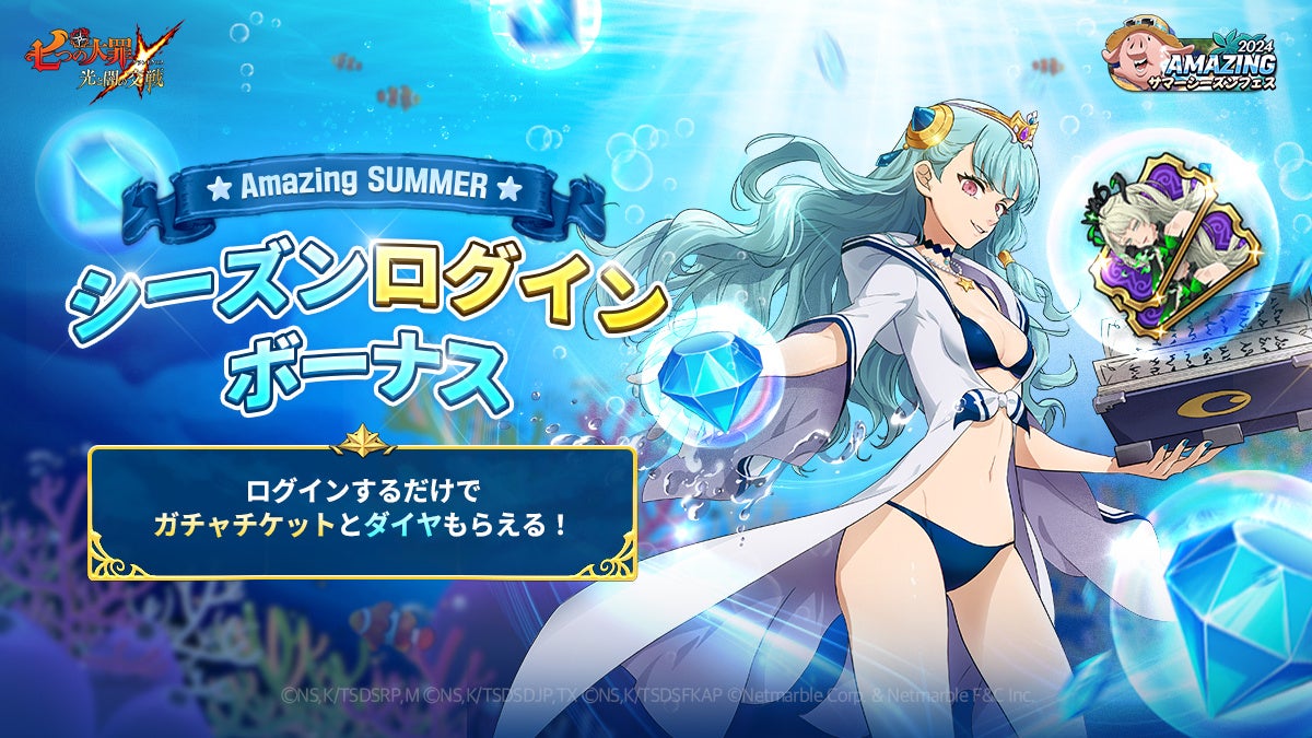 さらに、28日間ログインするだけで、最大フェスガチャチケット30枚やダイヤ150個がもらえる「Amazing サマーシーズンフェスログインボーナス」も開催されます。