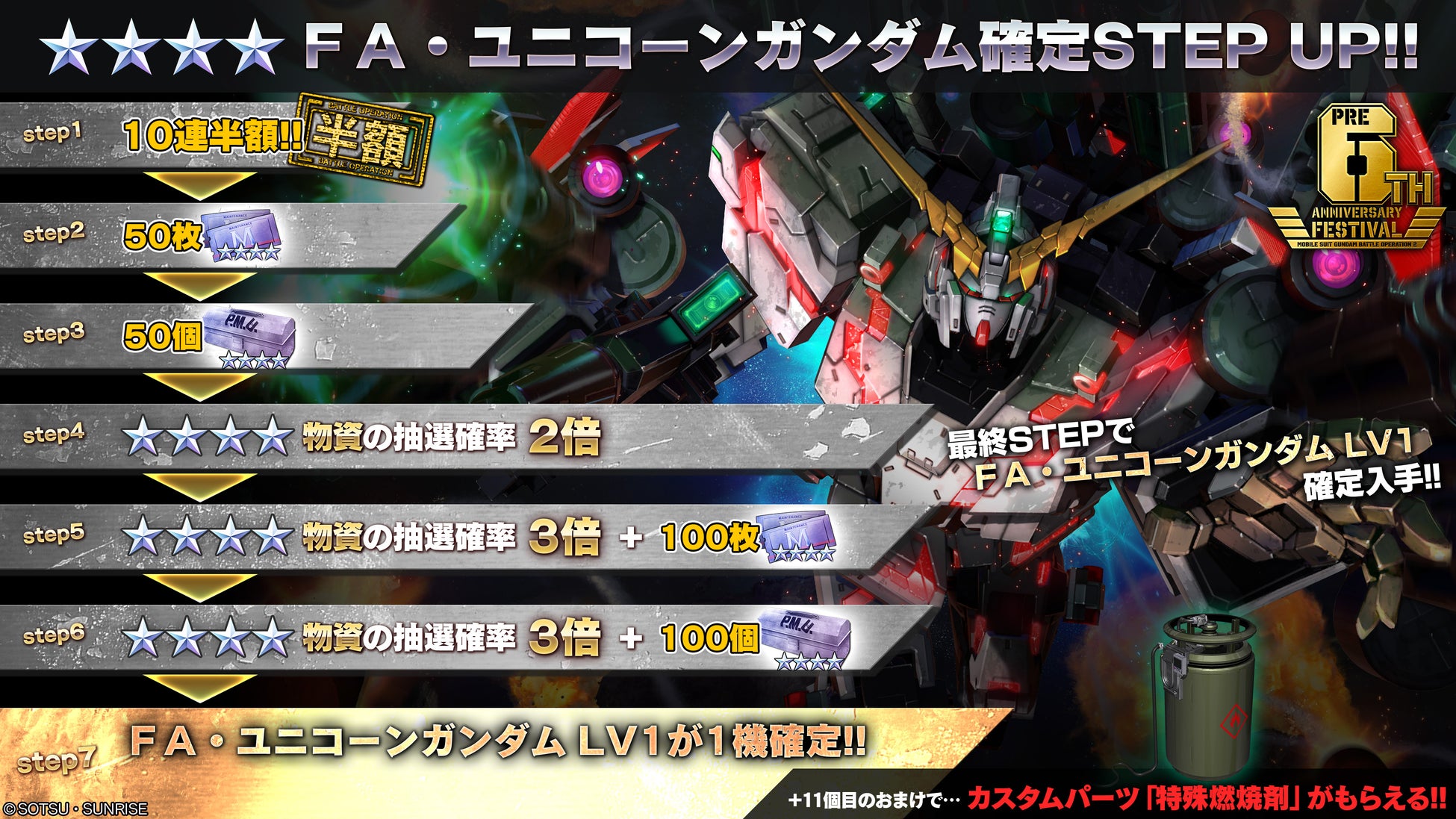 最終のSTEP7では、「FA・ユニコーンガンダム」とカスタムパーツ「特殊燃焼剤」が手に入ります。