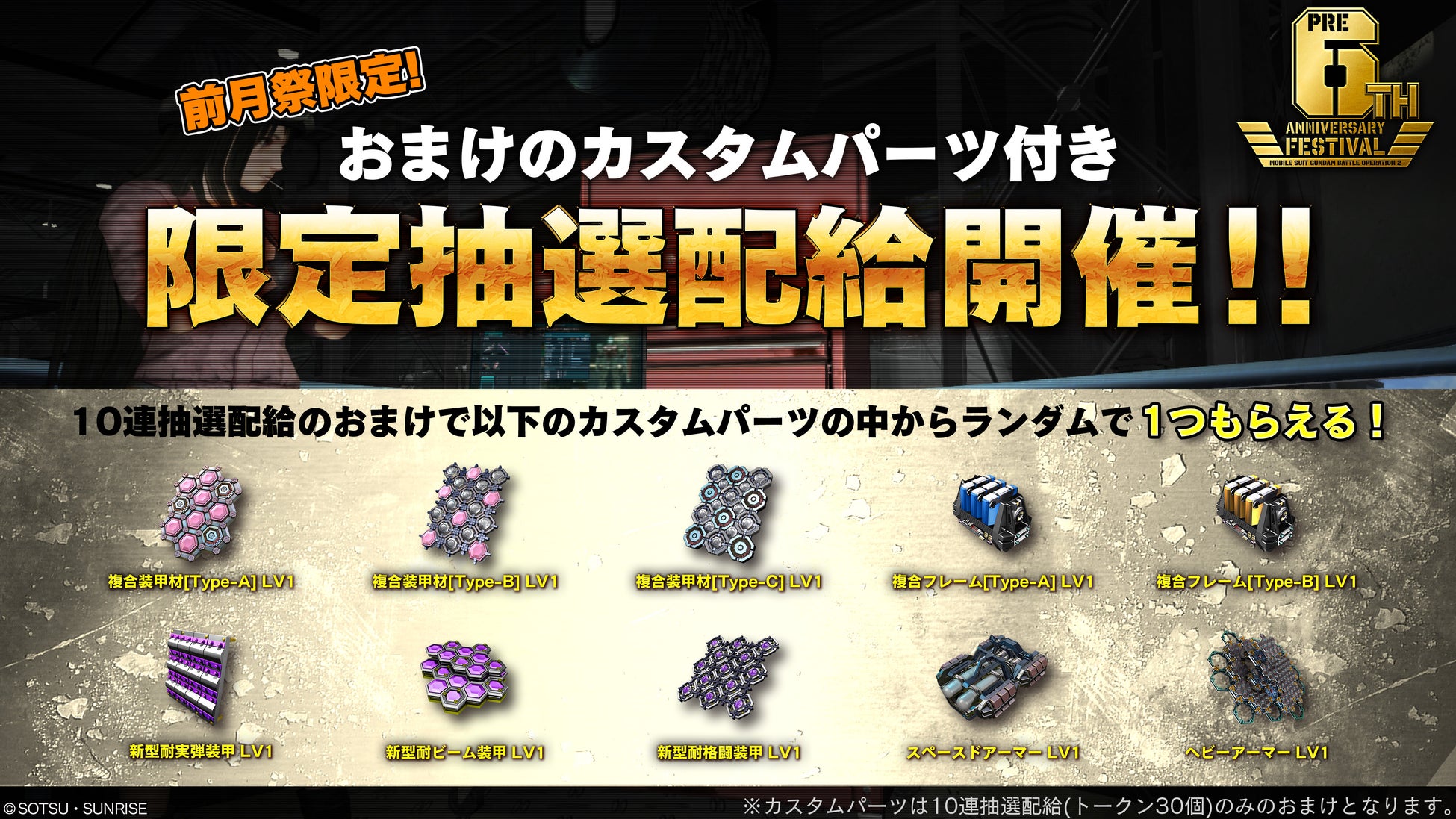 「6周年前月祭」では、他にも期間限定任務やカスタムパーツオマケつき限定抽選配給など、様々なキャンペーンが開催されています。