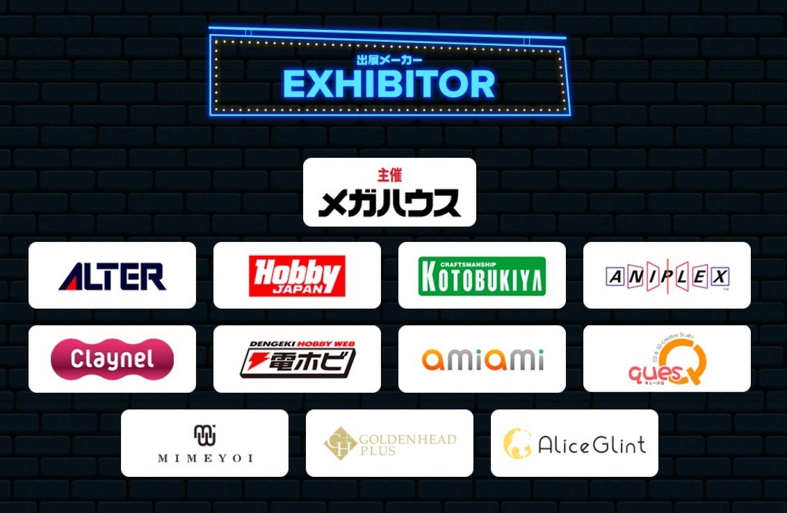 出展企業は、メガハウス、アルター、ホビージャパン、壽屋、アニプレックス、クレーネル、KADOKAWA、あみあみ、キューズQ、ミメヨイ、サウザント、アリスグリントの12社です。