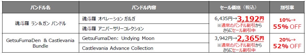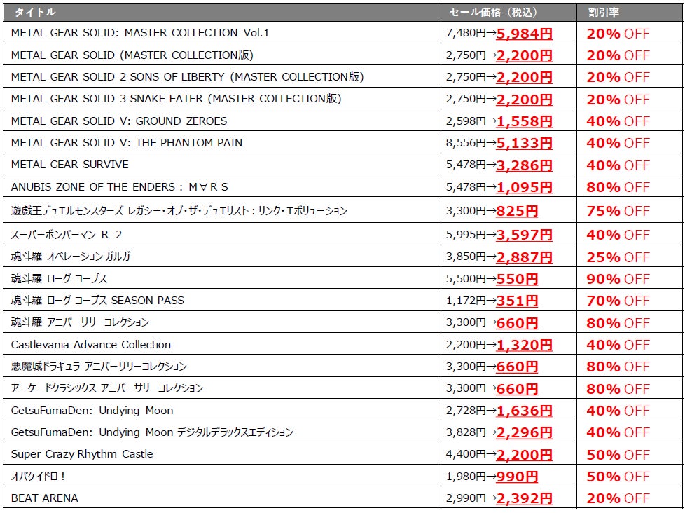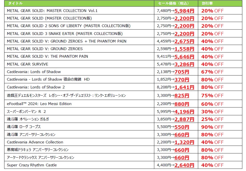 - 人気タイトル含むセール対象で、「メタルギア」や「魂斗羅」シリーズなど。