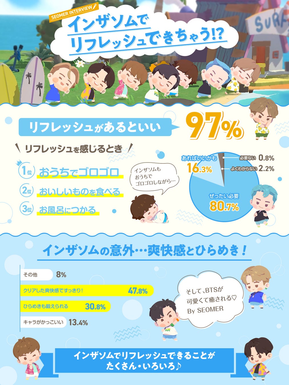 ゲーム公式X(Twitter)では、プレイヤーアンケートで「BTSIsland:インザソム」を自宅でのリフレッシュに利用する人が多いことから、リフレッシュに関するインタビューを実施しました。