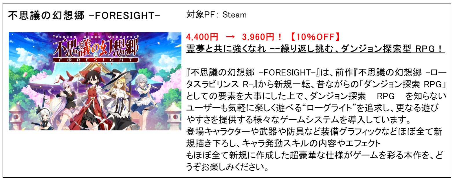 注目タイトルは、「東方Project」シリーズの最新作「東方虹龍洞 ~ Unconnected Marketeers ~」や、和風アクションRPG「朧村正」など、人気タイトルが多数含まれています。