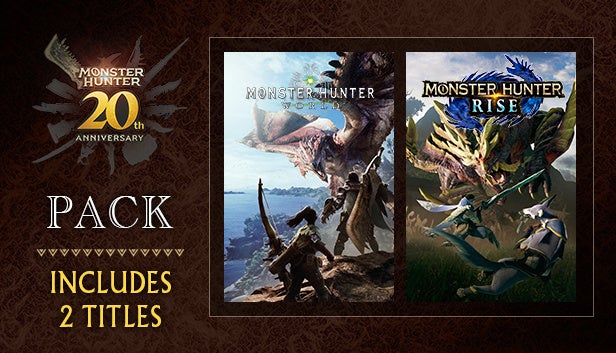 「MONSTER HUNTER 20TH ANNIVERSARY PACK」は、『モンスターハンター:ワールド』、『モンスターハンターライズ』の2作品が1,487円(税込)、「MONSTER HUNTER 20TH ANNIVERSARY COMPLETE PACK」は、『モンスターハンター:ワールド』、『モンスターハンターワールド:アイスボーン』、『モンスターハンターライズ』、『モンスターハンターライズ:サンブレイク』、『モンスターハンターストーリーズ2 ~破滅の翼~』の5作品が5,608円(税込)で販売されています。