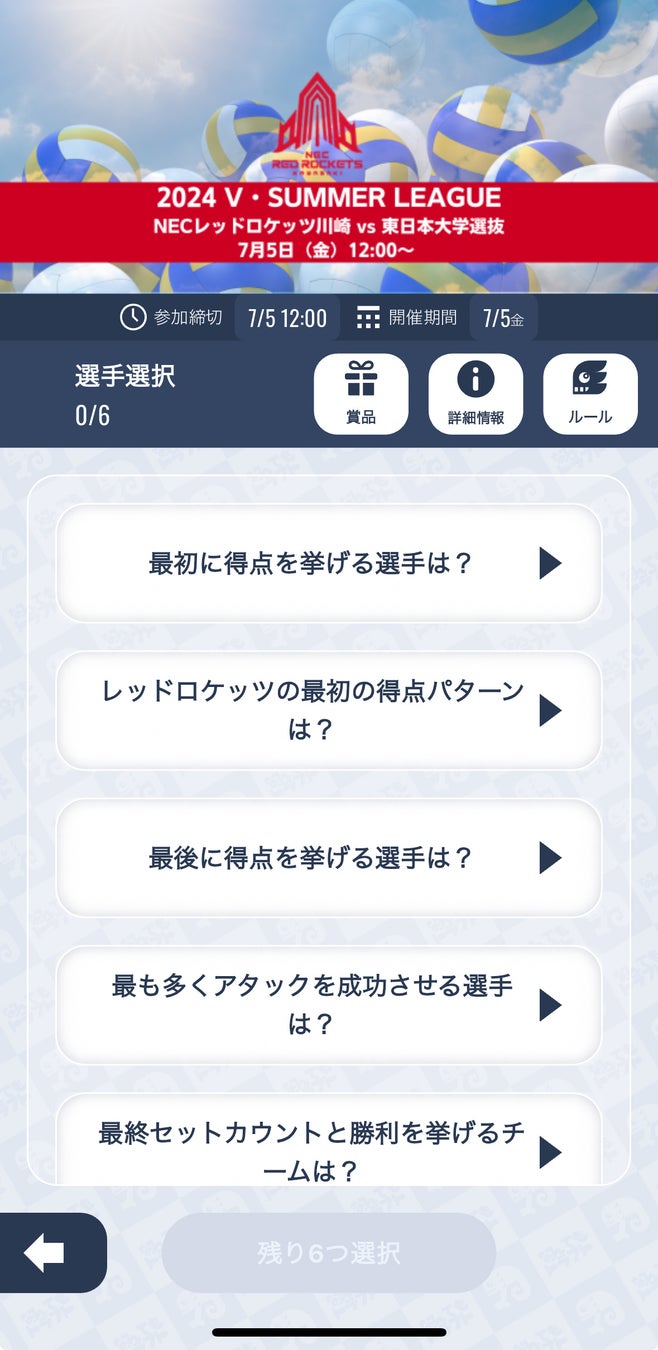 - 予想内容は得点、アタック成功数、勝利チーム、注目選手など