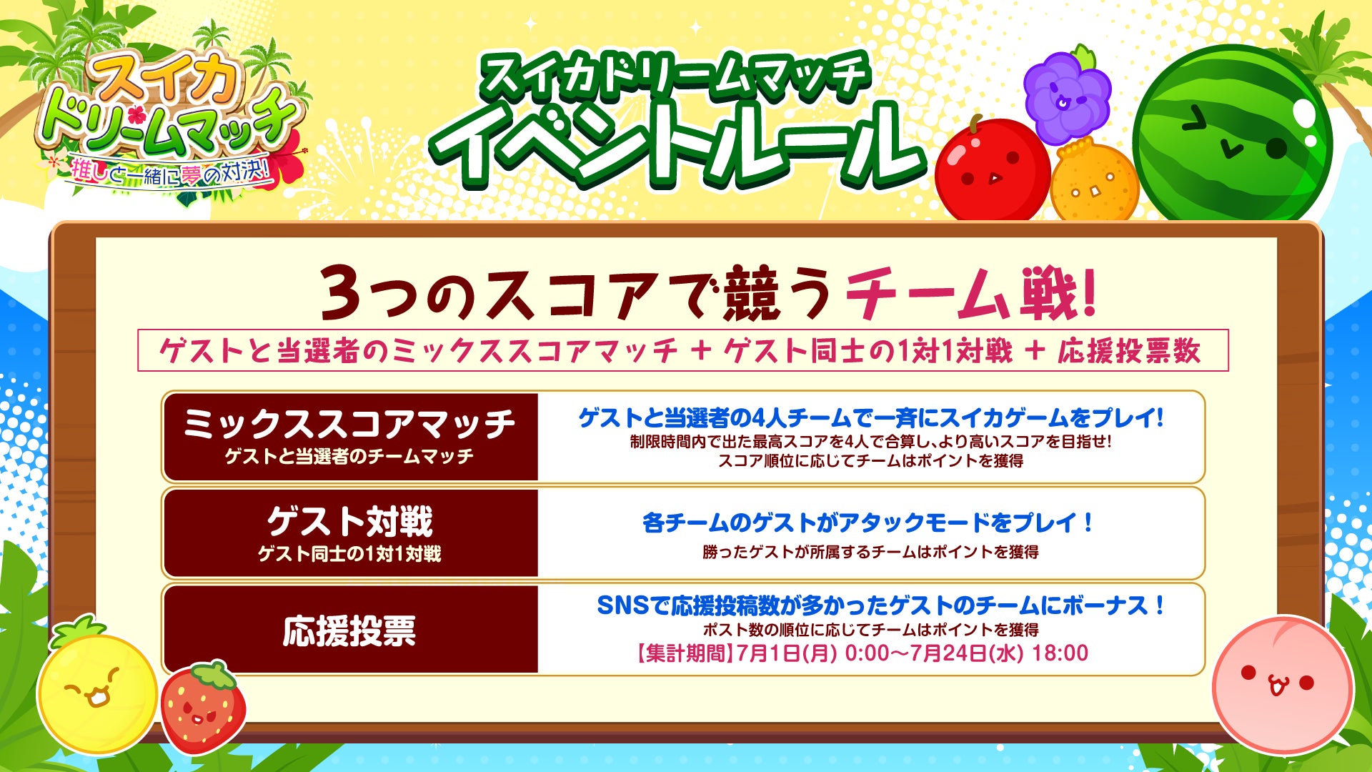 「スイカドリームマッチ」の参加には、7月1日(月)から7月15日(月)23:59までに、応援したいゲストのイベント専用ハッシュタグと「#スイカドリームマッチ参加希望」をつけて、Xで引用リポスト投稿する必要があります。