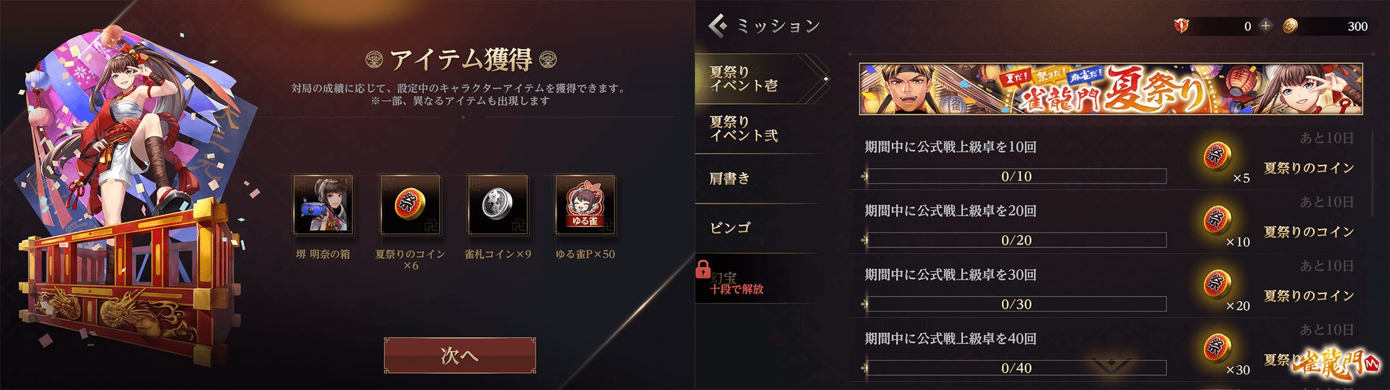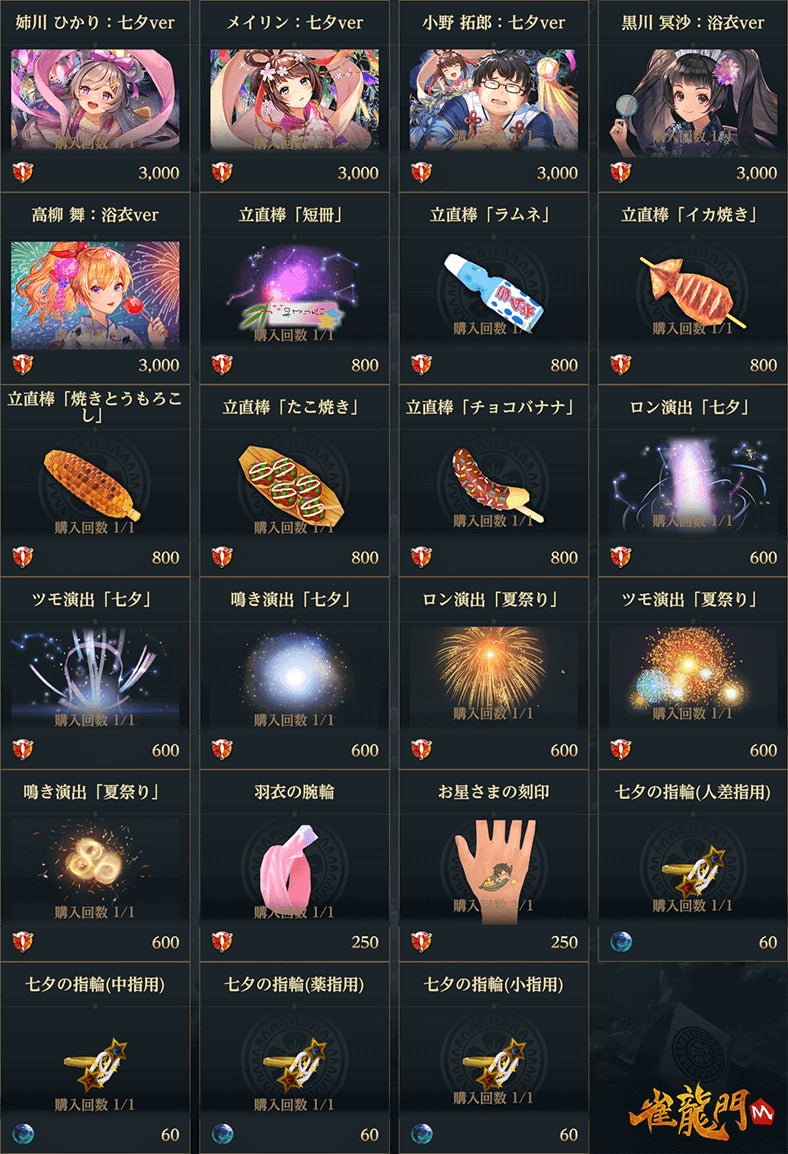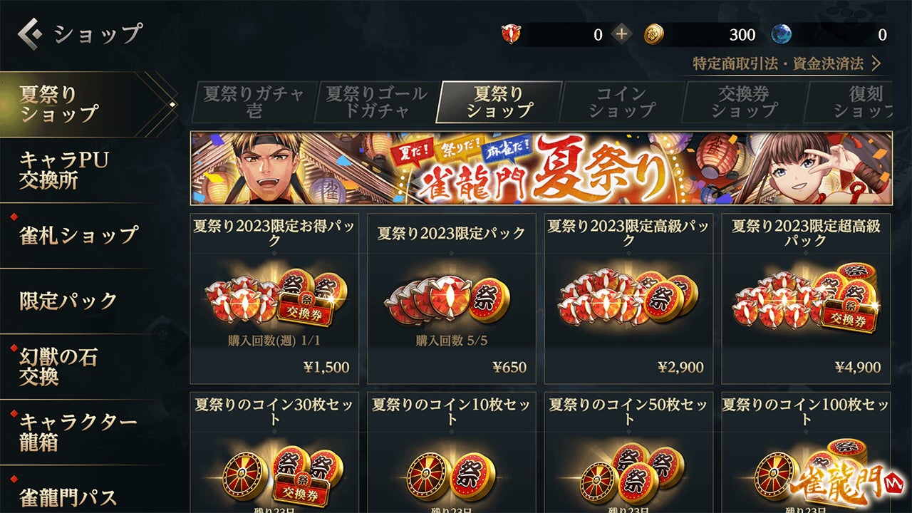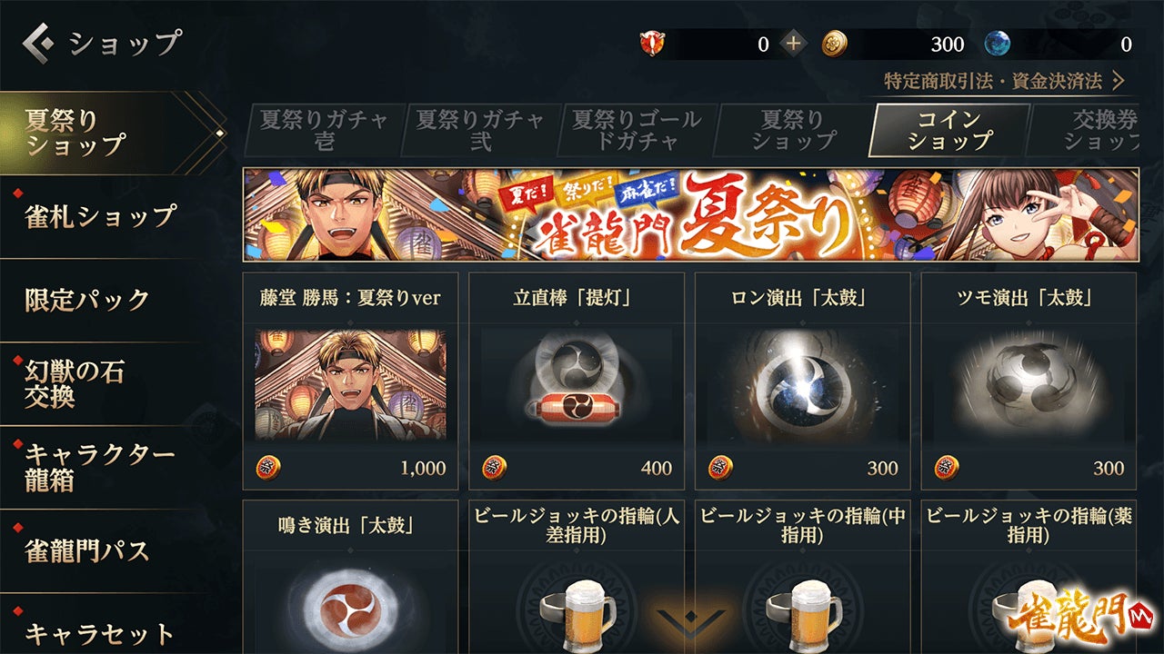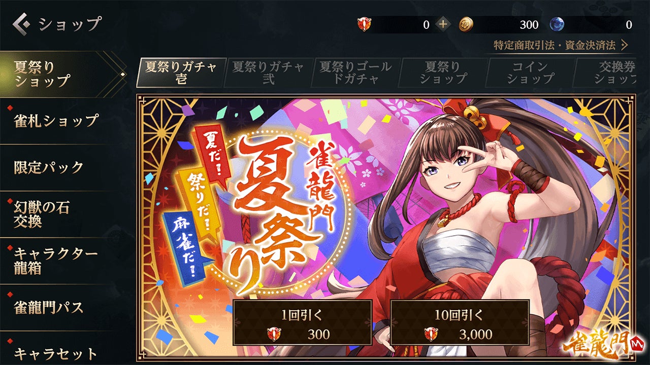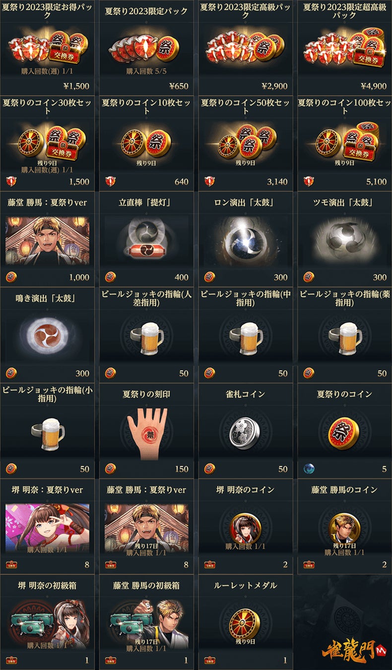 龍宝をお得に購入できる特別なパック商品や、「雀龍門夏祭り〜夏だ!祭りだ!麻雀だ!〜」イベント限定アイテムが出現するガチャなどをご用意しました。