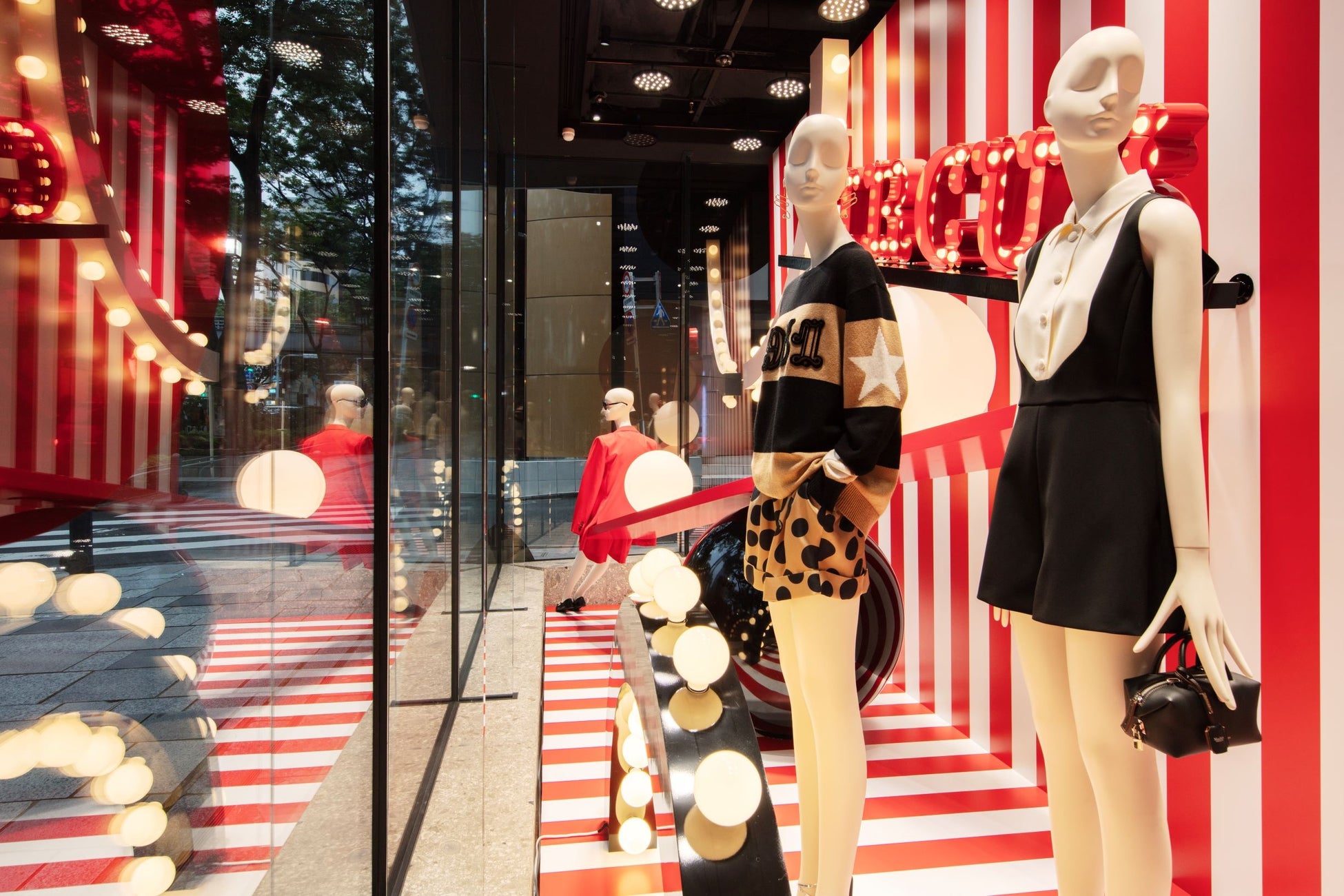 - 表参道店のガラスウィンドウには、コレクションのテーマであるサーカスを表現した鮮やかなディスプレイが飾られており、個性的で華やかなデザインが目を引く