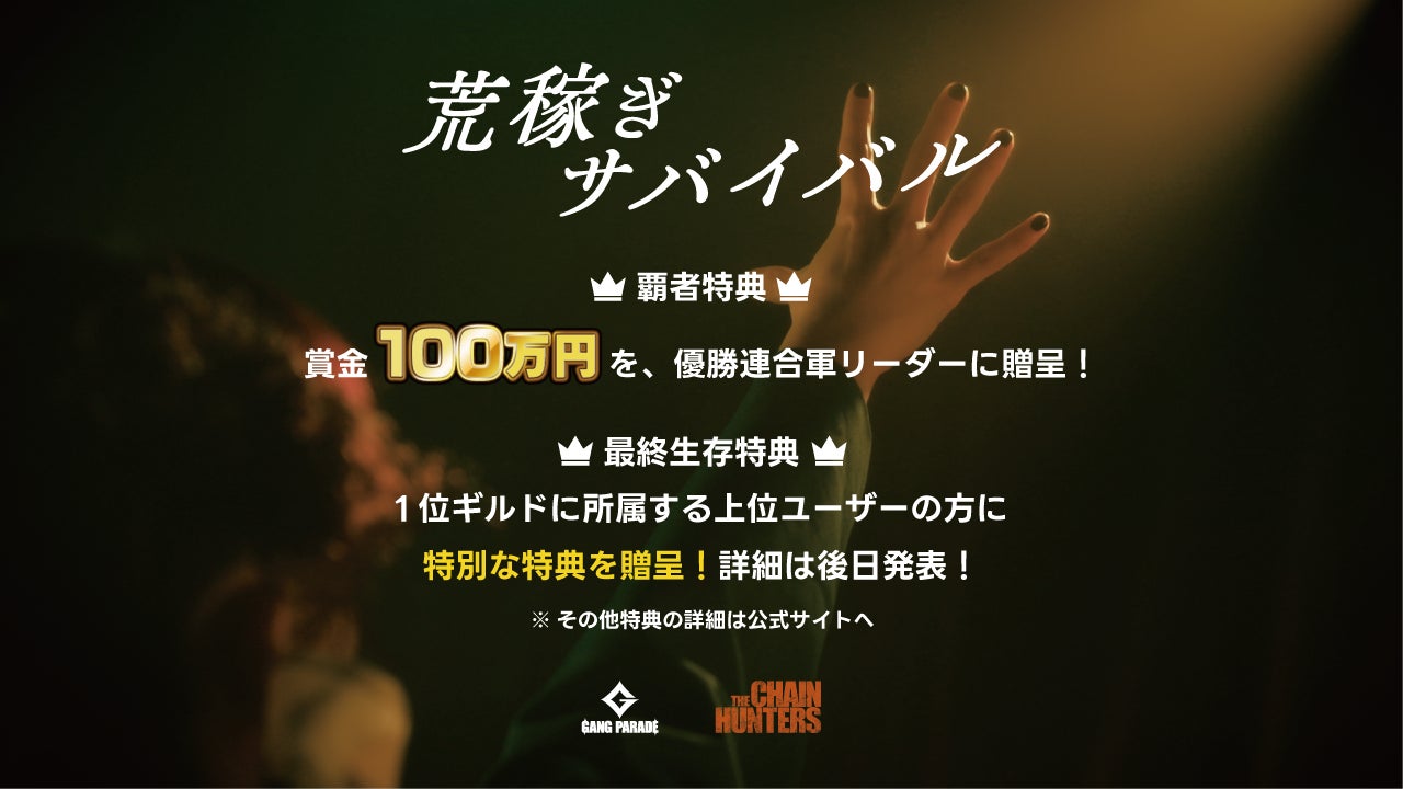 『THE CHAIN HUNTERS』では、8月1日からGANG PARADEメンバーが率いるギルド連合軍による賞金100万円を賭けた「荒稼ぎサバイバル」が開催されます。