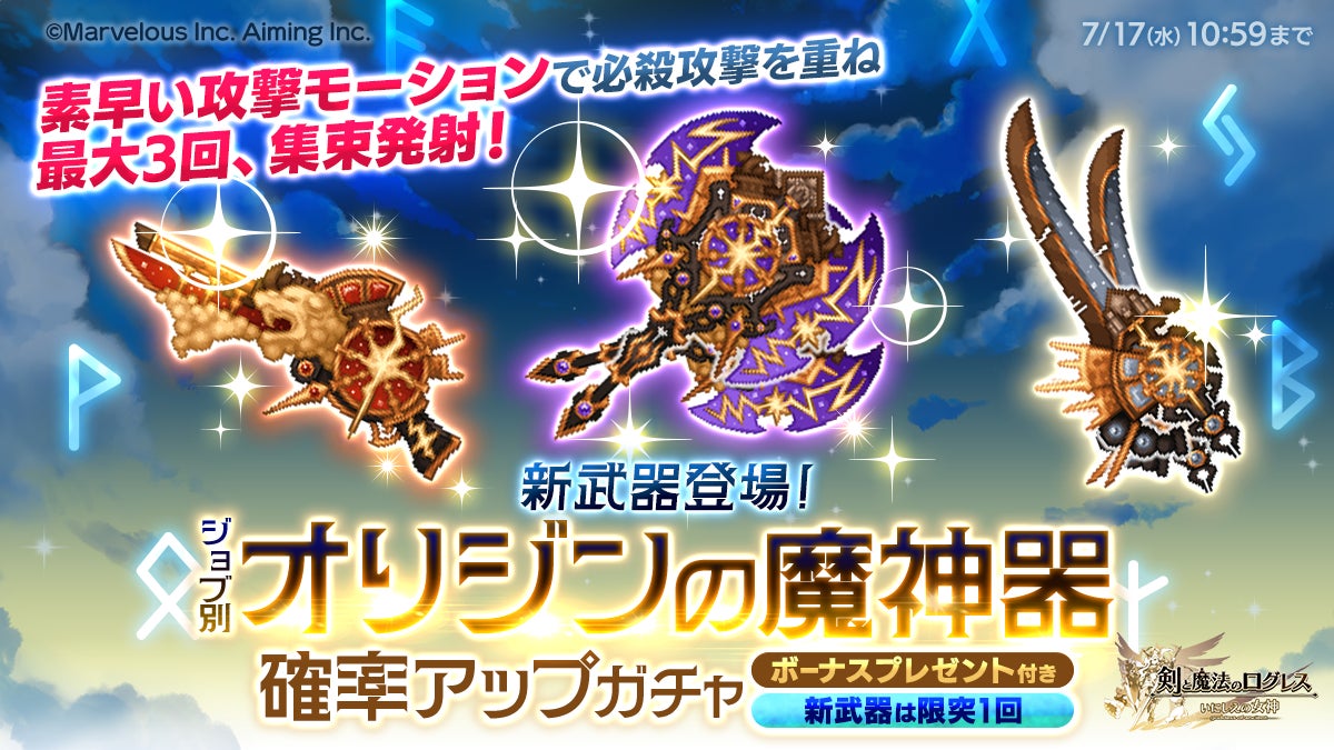 - 新シリーズ「オリジンの魔神器確率アップガチャ」も開催中で、魔銃、覇双、羅刹の武器が登場