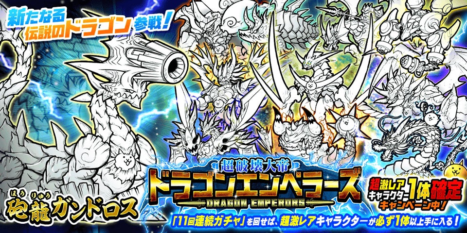 「にゃんこ大戦争」に、新たな伝説のドラゴン「砲龍ガンドロス」が参戦します! 7月4日(木)11:00から開催される期間限定レアガチャ「超破壊大帝ドラゴンエンペラーズ」でゲットできます。