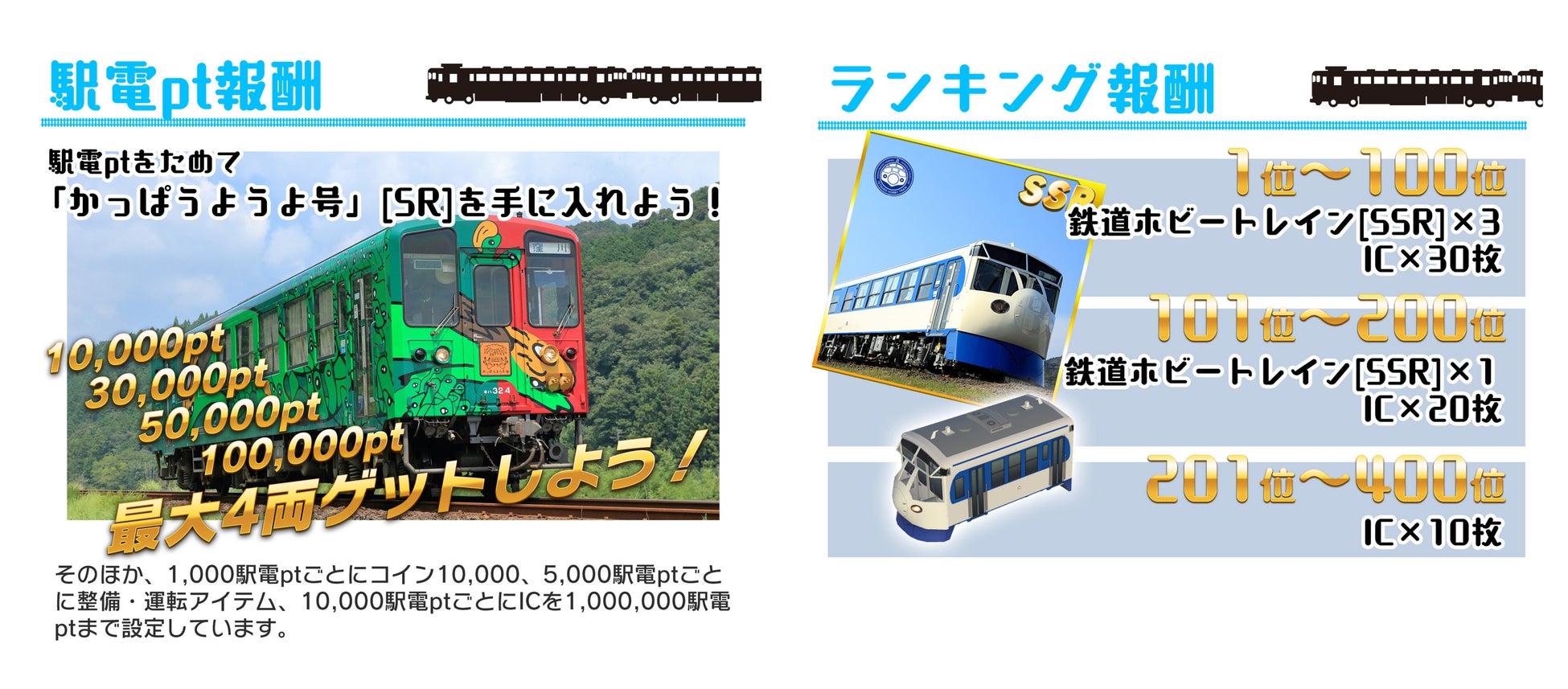 期間限定イベント「駅電」では、リレー形式の鉄道コンテストで他のユーザーとタイムを競い、ポイントを貯めると、海洋堂ホビートレイン「かっぱうようよ号」[SR]など、特別な車両(ソダテツ)を手に入れることができます。