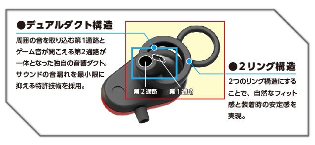 周囲の音や空気を取り込むダクトと、ゲーム音を取り入れるダクトが分かれている【デュアルダクト構造】を採用した、今までにない全く新しいイヤホンです。