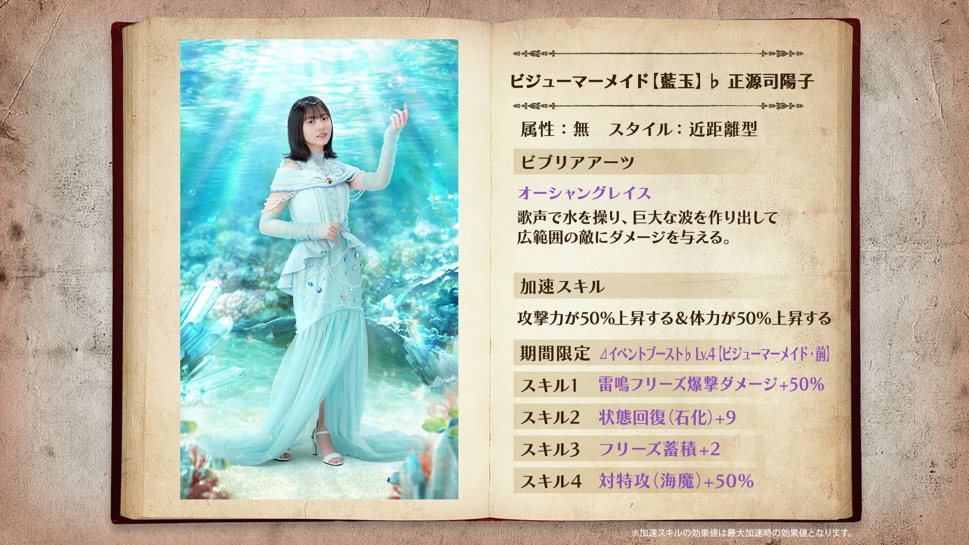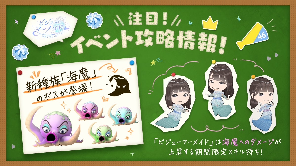 今回のイベントでは、新種族「海魔」が登場し、イベント限定のメンバーカード「★4 ビジューマーメイド【藍玉】♭ 正源司陽子」や「★4 逃げきりマーメイド 松田好花」などを手に入れることができます。