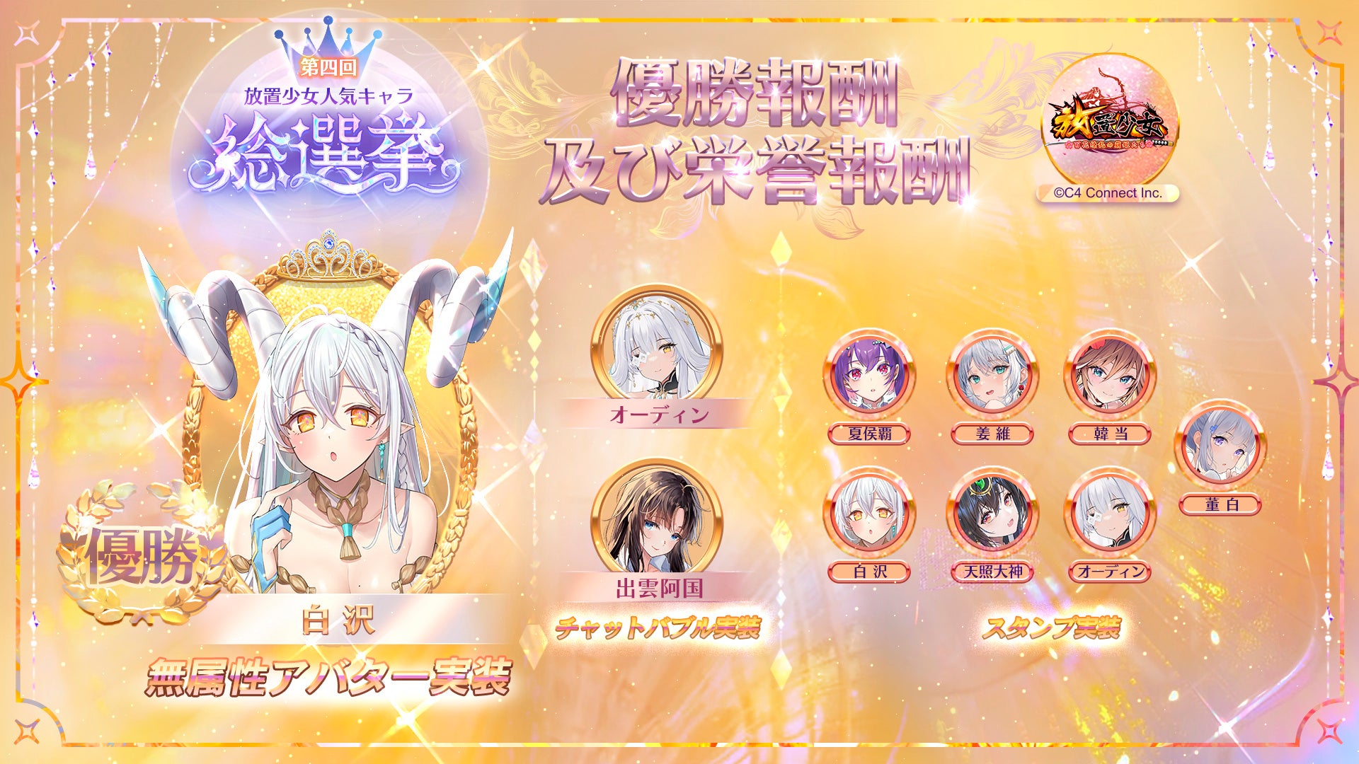 「第四回放置少女人気キャラ総選挙」結果発表!頂点に君臨したのは 『白沢』!