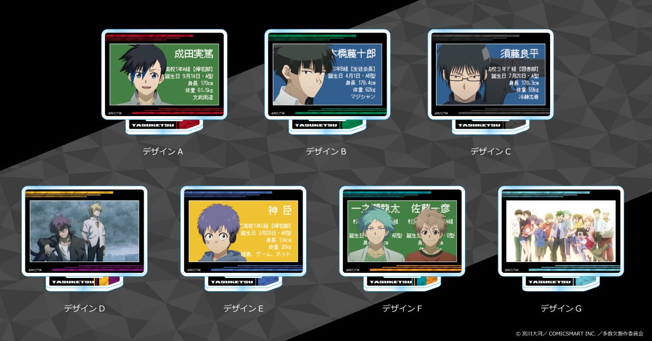 - アクリルスタンド、六角形缶バッジ、パスケース、レザーバッジ(丸型)、レザーバッジ(ロング)、アクリルキーホルダー