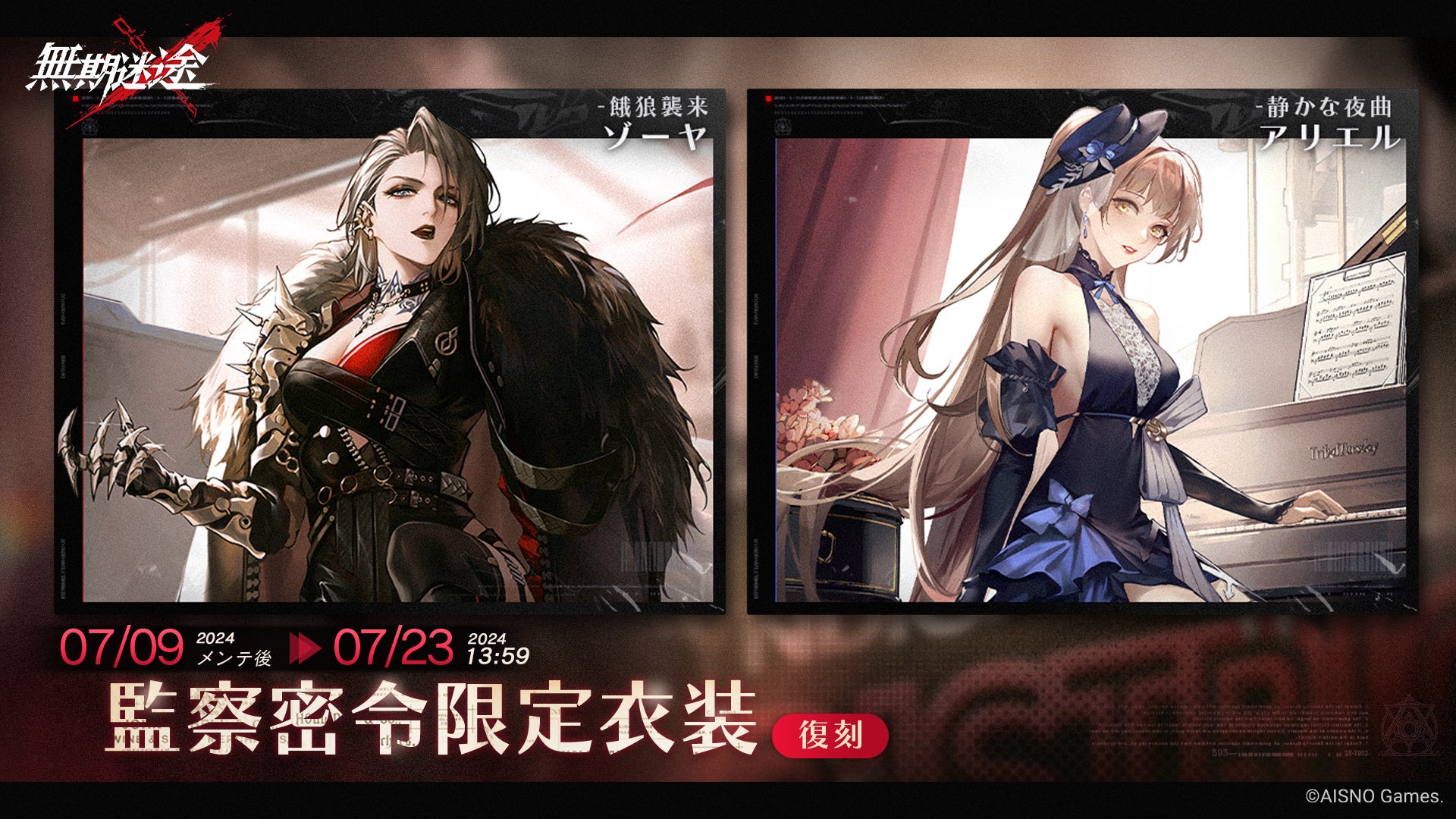 また、「監察密令」限定の星3衣装「ゾーヤ・餓狼襲来」と「アリエル・静かな夜曲」が期間限定で復刻販売されます。
