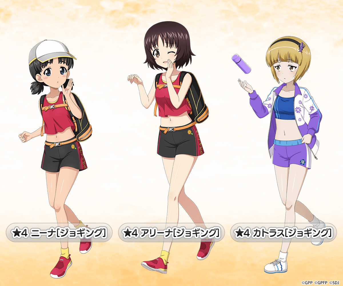 7月1日(土)13時から開始する7月日替わりイベントに、ジョギング衣装のニーナ、アリーナ、カトラスが新生徒として登場いたします。