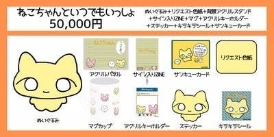 ぬいぐるみ(高さ約27cm横約30cm奥行き約27cm/素材:ベルボア)、リクエスト色紙、          背景アクリルスタンド、サイン入りZINE、マグカップ、アクリルキーホルダー、キラキラシール、ステッカー、サンキューカード