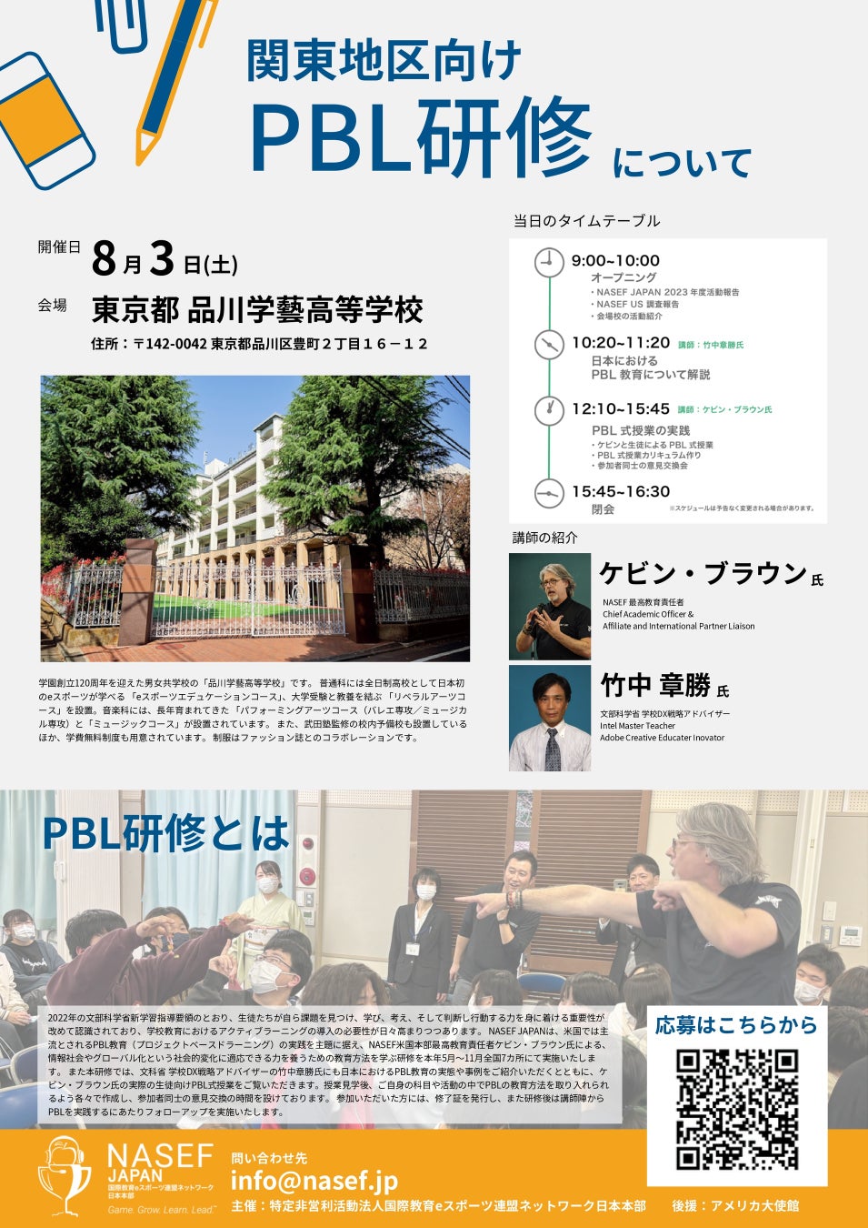 アメリカのNASEF最高教育責任者、ケビン・ブラウン氏と、文部科学省学校DX戦略アドバイザーの竹中章勝氏が講師を務めます。