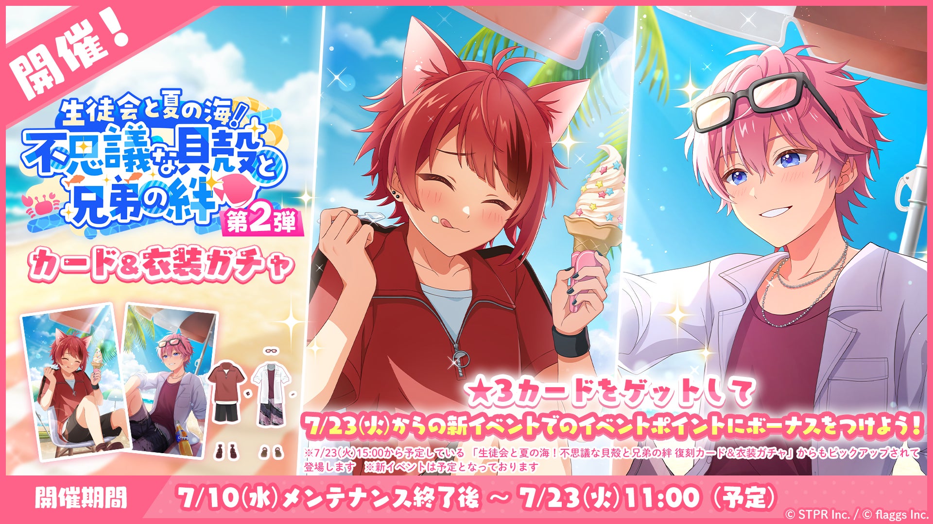 さらに、イベント開催に合わせて、「生徒会と夏の海!不思議な貝殻と兄弟の絆 第2弾 カード&衣装ガチャ」と「生徒会と夏の海!不思議な貝殻と兄弟の絆 第2弾 デコガチャ」も開催中です。