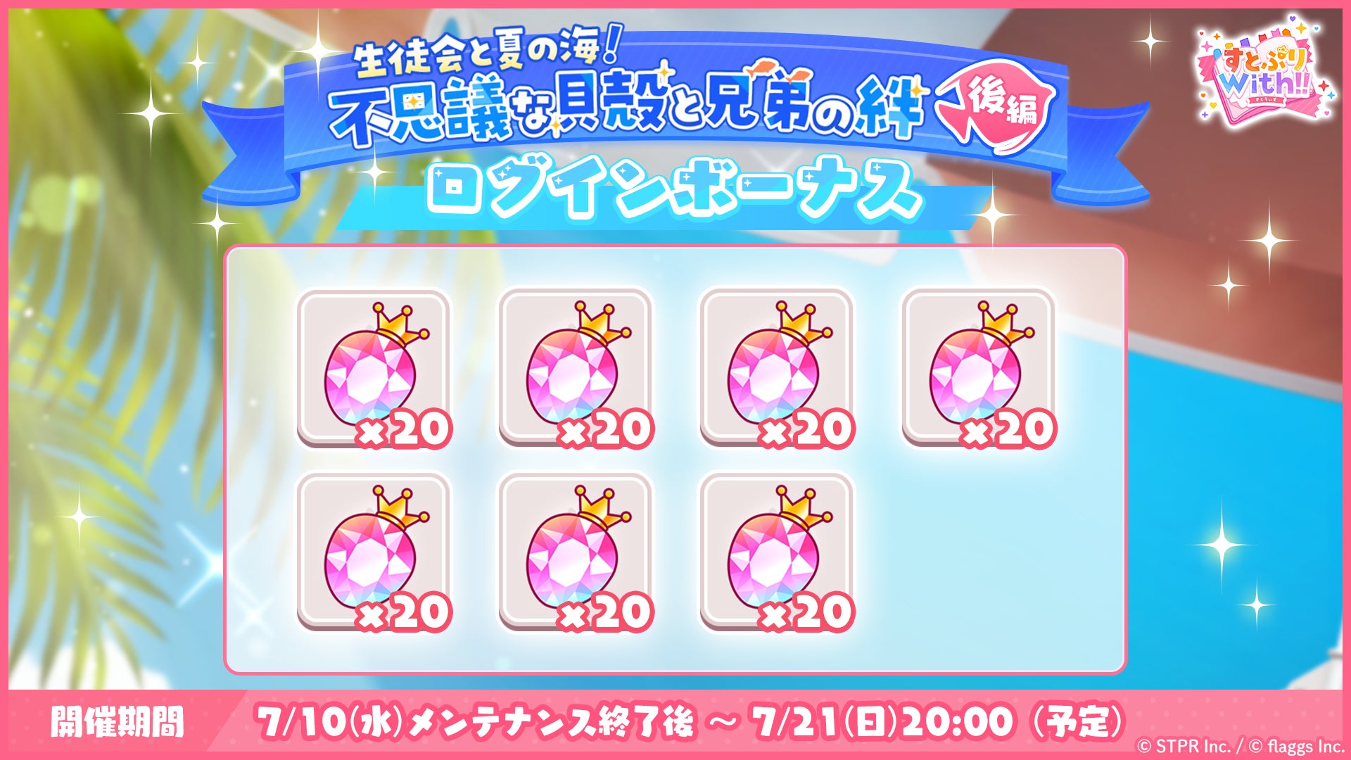 イベント期間中は「生徒会と夏の海!不思議な貝殻と兄弟の絆 後編 ログインボーナス」も実施され、7日間ログインすると、無償ベリーを最大140個獲得できます。