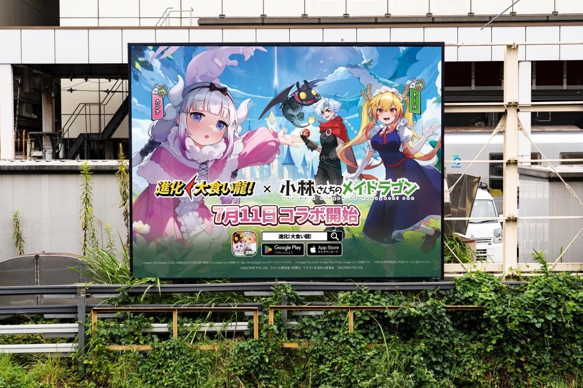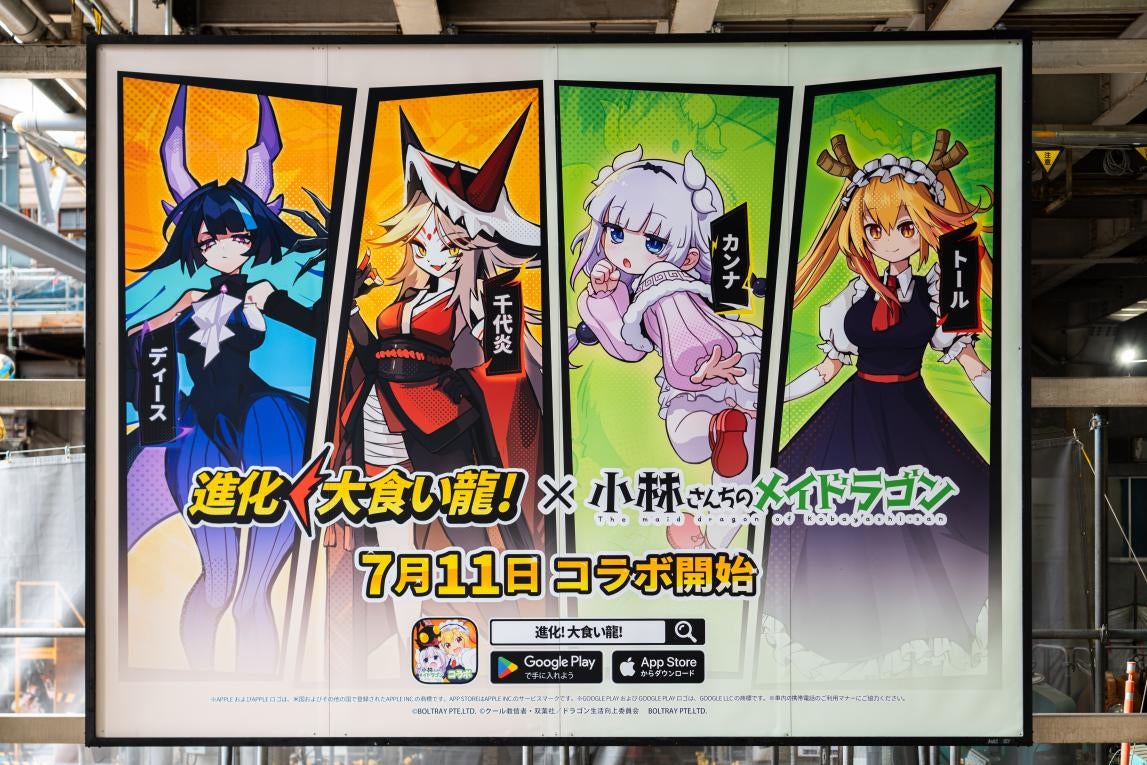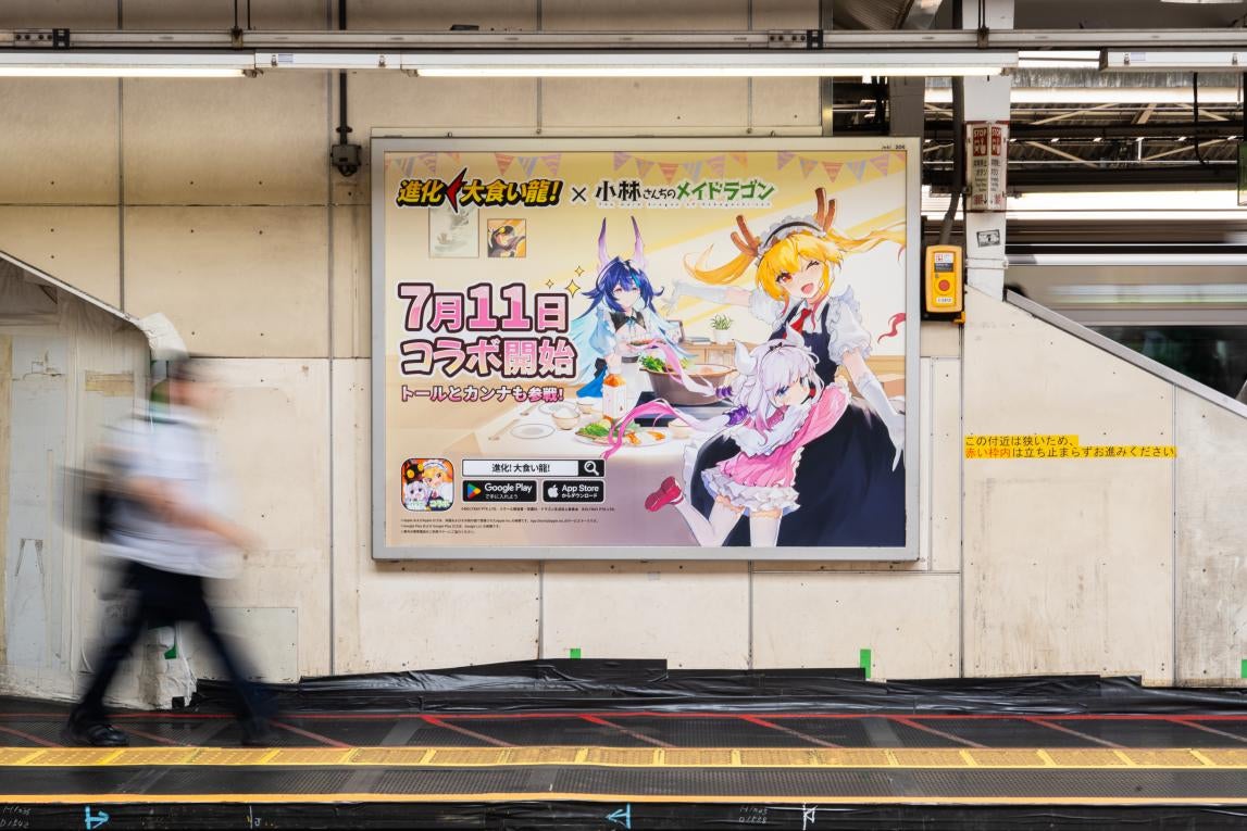 さらに、7月1日(月)から7月31日(水)にかけて、JR新宿駅、JR池袋駅、JR品川駅の3駅および渋谷スクランブル交差点にて、『進化! 大食い龍!』×『小林さんちのメイドラゴン』のコラボ広告が掲出されています。