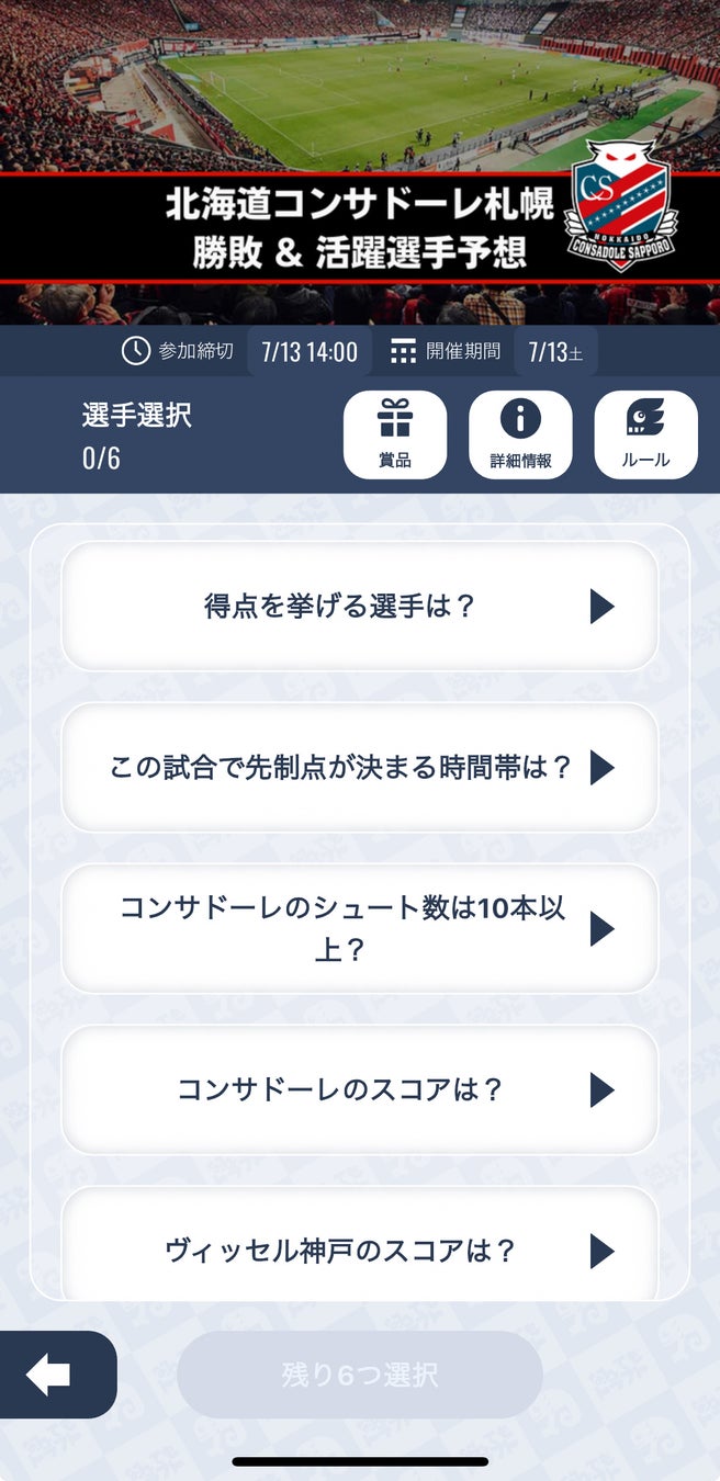 予想内容は、スタメン予想では対象試合のスタメン選手11名を予想、試合展開予想では、得点者を予想するなど、試合展開に関する複数の項目を予想します。