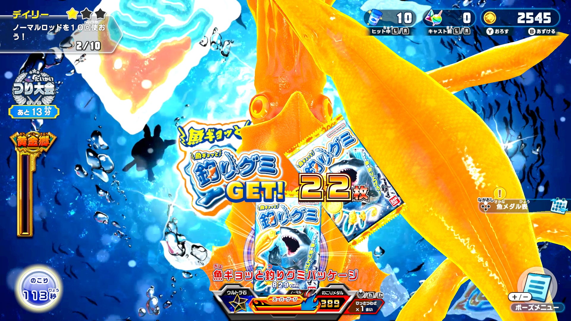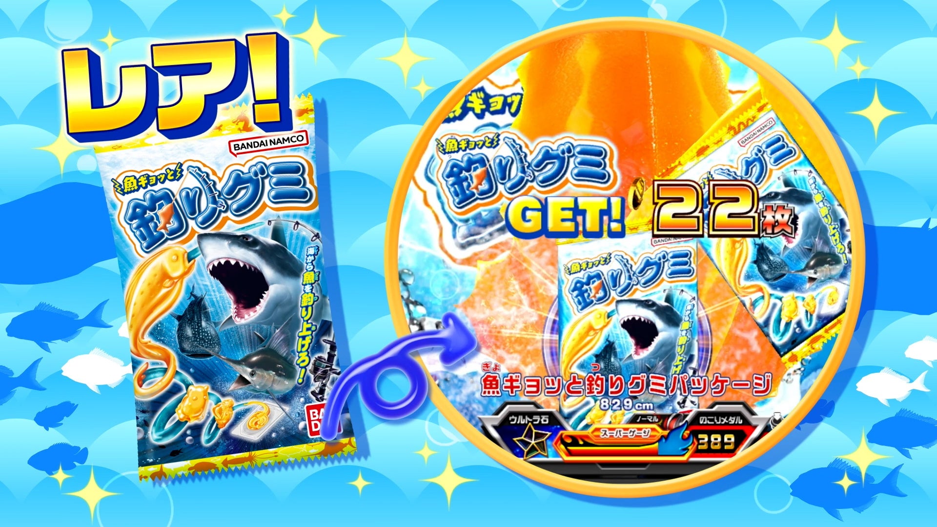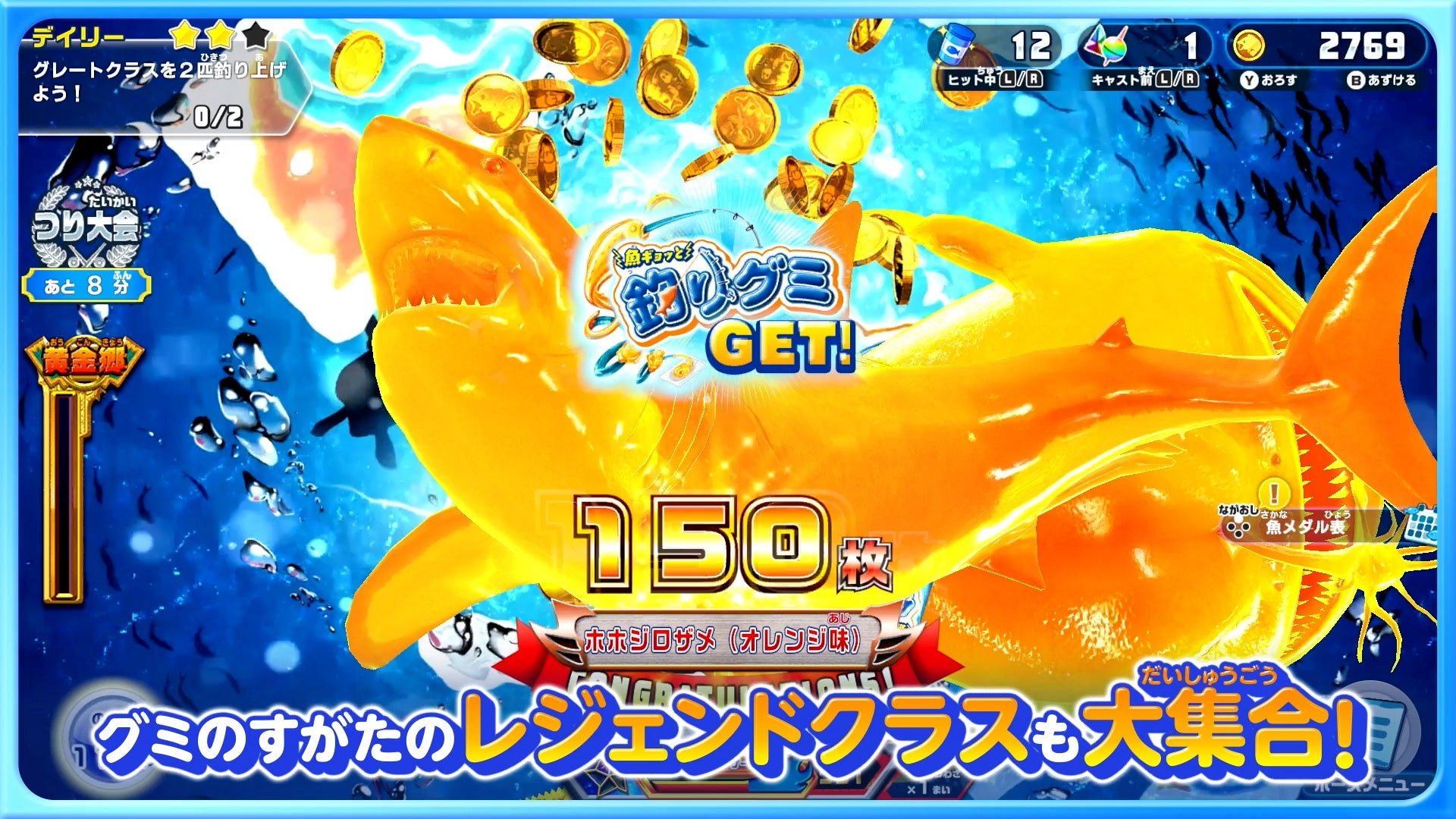 さらに、オオモノ魚ギョッと釣りグミフェイズでは、「魚ギョッと釣りグミレジェンドクラス」が登場し、釣り上げると150枚のメダルを獲得できます。