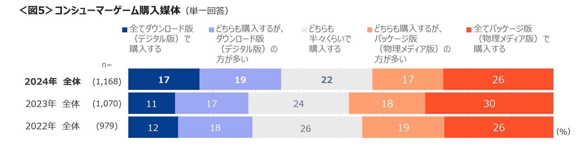 ゲームの購入媒体では、パッケージ版を購入する人が依然として多いですが、「全てダウンロード版で購入する」は、昨年より6ポイント上昇しています。