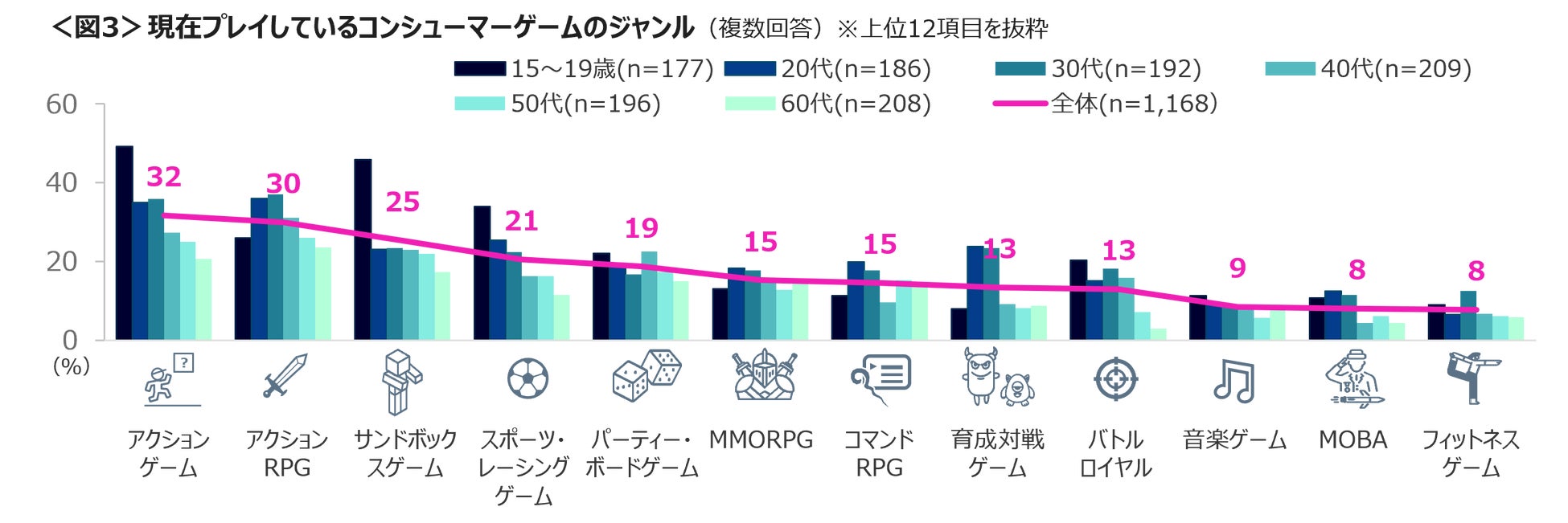 特に15~19歳では、「アクション」「サンドボックス」「スポーツ・レーシング」のプレイ率が3~4割台と、他の年代よりも高い結果となりました。