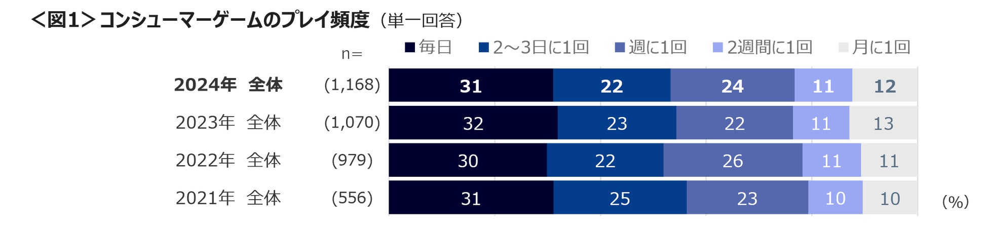 - プレイ頻度では、毎日プレイする人が31%、2~3日に1回プレイする人が22%と、半数以上が頻繁にプレイ
