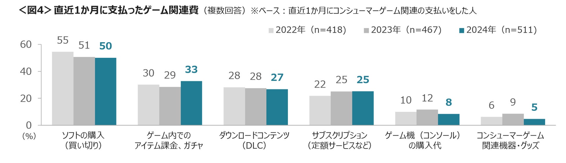 ゲーム関連費では、ソフトの購入が最も多く、次いでゲーム内でのアイテム課金、ガチャ、ダウンロードコンテンツ、サブスクリプションとなっています。