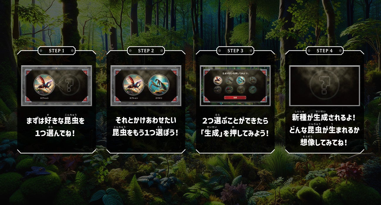 • AIがオリジナルの昆虫を生成するコンテンツで、好きな昆虫を2つ選び組み合わせる