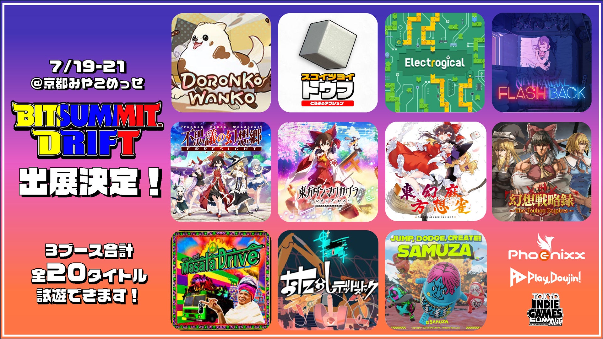 さらに、「Play,Doujin!」と共同で“Play,Doujin! BitSummit出張所”ブース、「TOKYO INDIE GAMES SUMMIT」と共同で“TOKYO INDIE GAMES SUMMIT”ブースと、全3ブースの出展が決定しました。