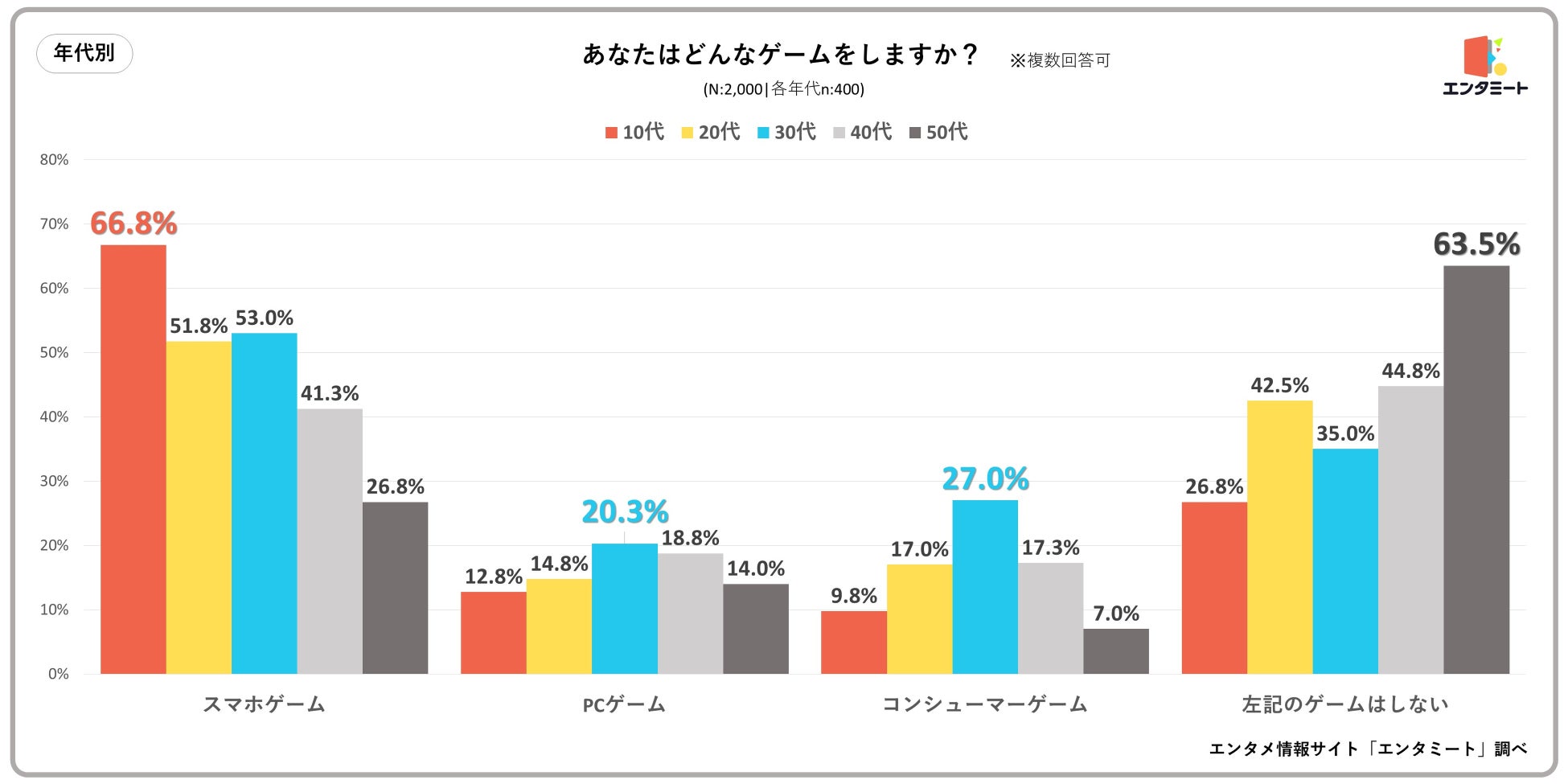 10代~50代の男女2,000人を対象に調査した結果、スマホゲームは幅広い年代で人気で、特に10代では66.8%と大多数の人がプレイしています。