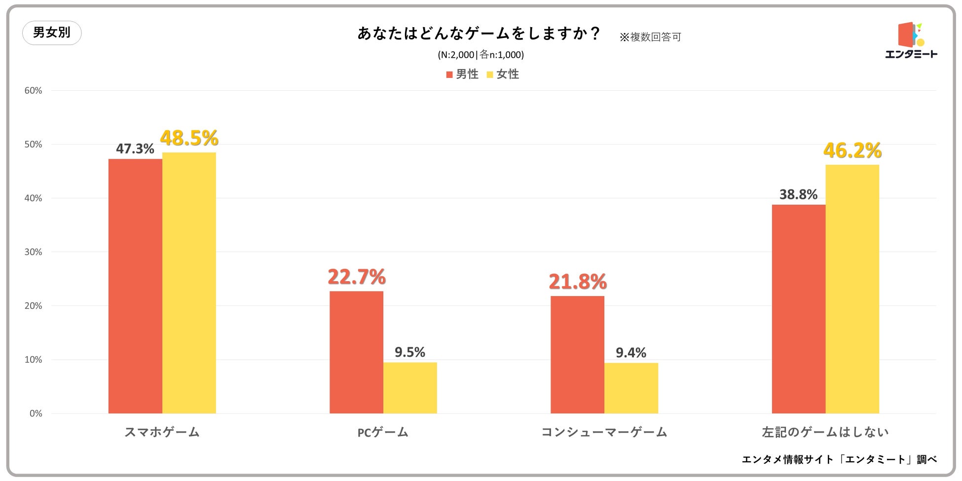 男女別では、スマホゲームは男女差がほとんどありませんでしたが、PCゲームやコンシューマーゲームは男性の回答率が10%以上高くなっています。