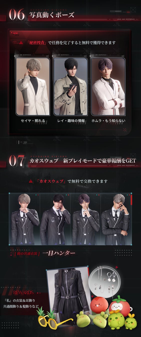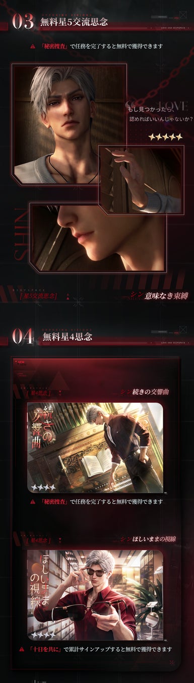 - 恋と深空、恋とプロデューサー、Glint写真館、カオスウェブ、幻象、心の跡、深空試練、秘密捜査、無防備な禁区、狙い撃つ心、十日を共に、秘密の約束、シン・意味なき束縛、シン・続きの交響曲、時空を超える、シン・無防備な禁区、シン・ほしいままの視線、ホムラ・ほろ酔い、シン・窮地、メカ猫耳、シン・名残、極空願い券、深空願い券、恋シリーズ、インフィニティニキ、App Store、Google Play ストア、X、YouTube、TikTok