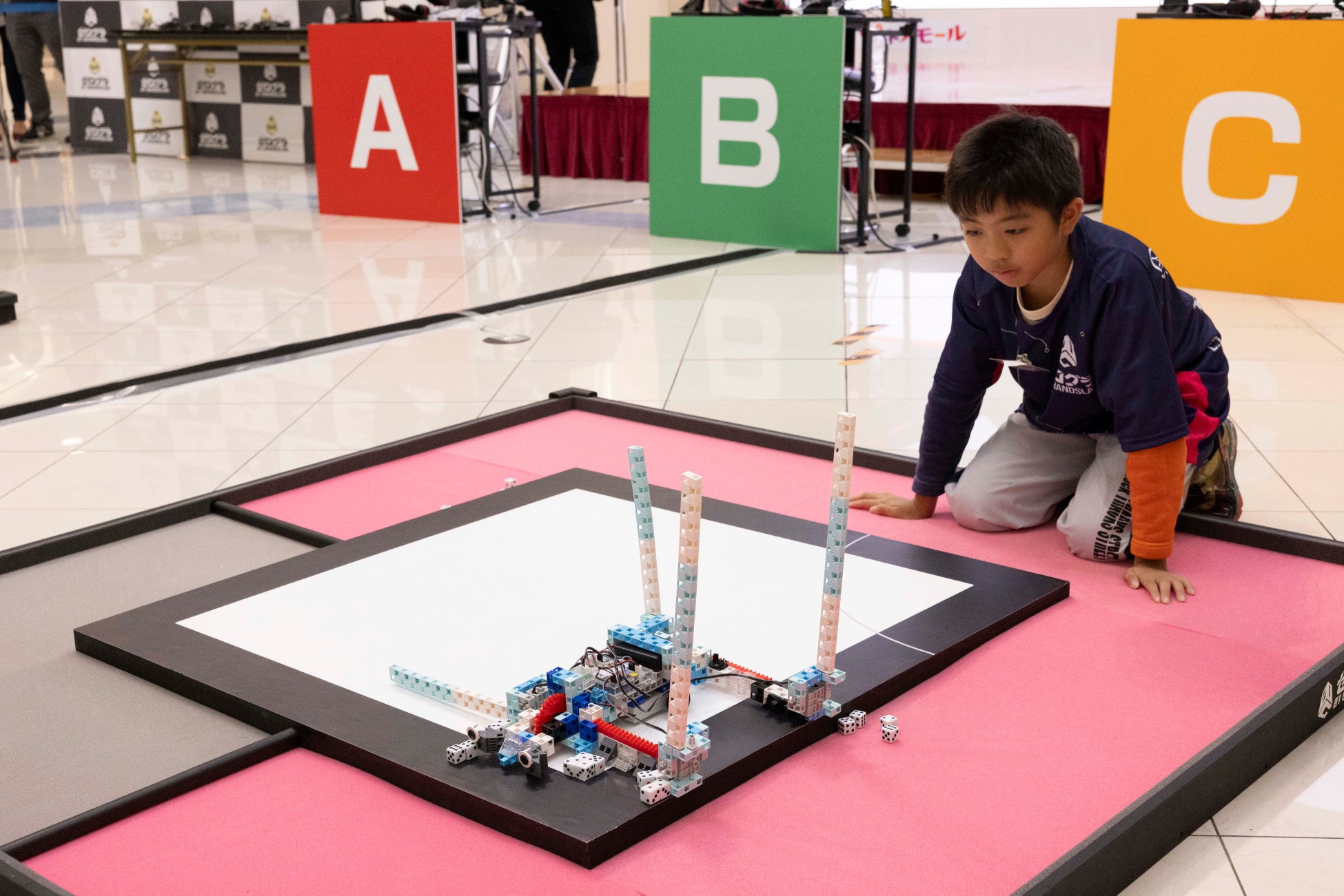 ロボット競技では、アーテックロボ、KOOV、SPIKEプライムの3つのロボットから1つを選択し、ターゲット落としバトルに挑戦します。