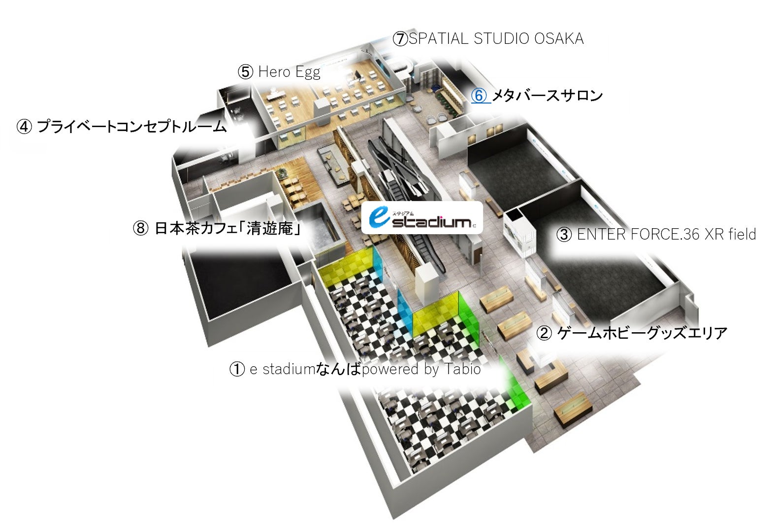- e stadiumなんばpowered by Tabio、ENTER FORCE.36 XR field、プライベートコンセプトルーム、Hero Egg、メタバースサロン、清遊庵、SPATIAL STUDIO OSAKA