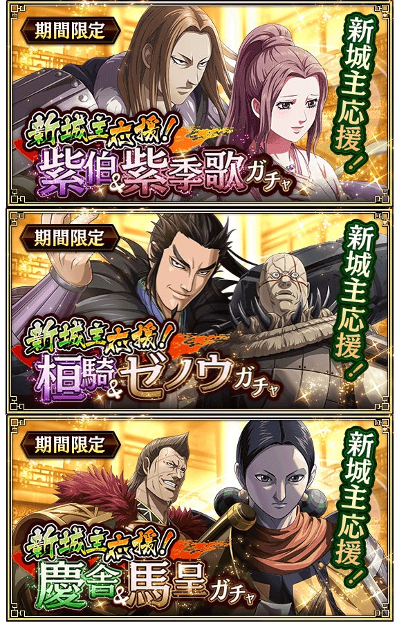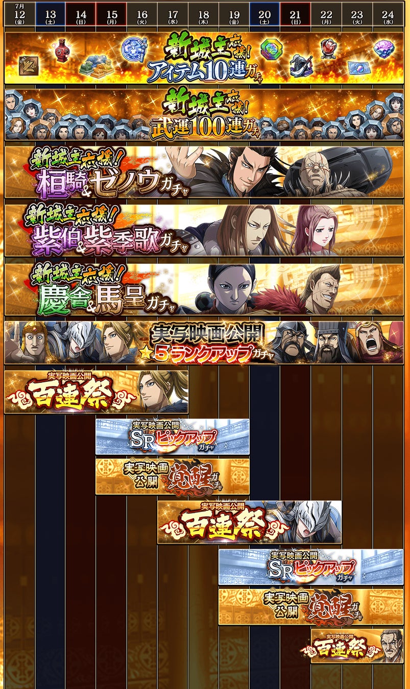 - LG楽乗、LG我呂、SR魏加、SR李白、UR龐煖、李牧の武運、摎の武運、昌文君の武運、映画公開★5RUガチャチケ、万能武運、LG祝剣、新城主応援ガチャチケ、龍剣石Lv3、争覇解放石、★4武将選択宝箱【映画公開】、★5武将選択宝箱【映画公開】