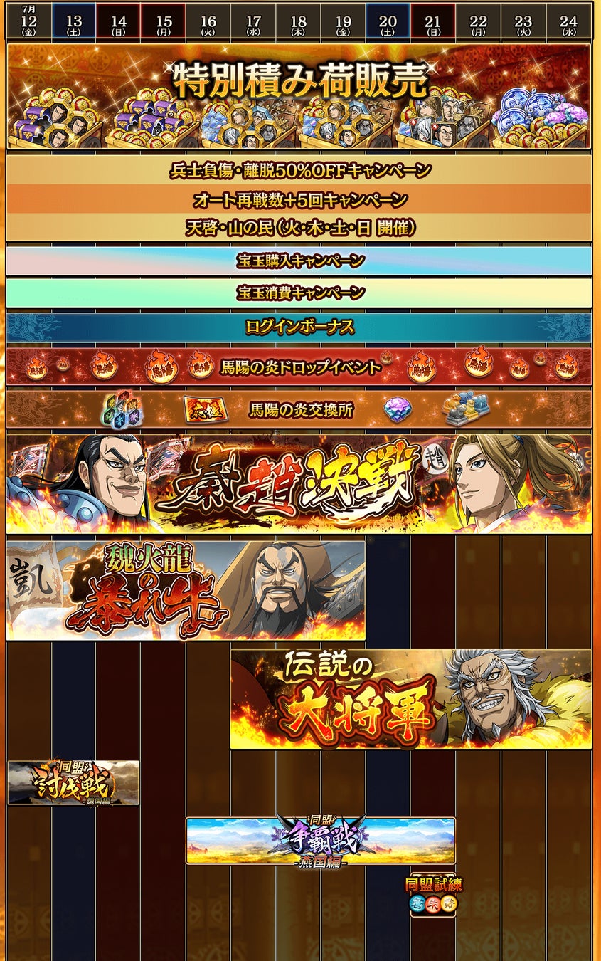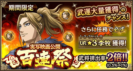 - キャンペーンでは、SR★3魏加、SR★3李白のプレゼントやUR★3龐煖の武将Lvアップ、武運配布が行われる。