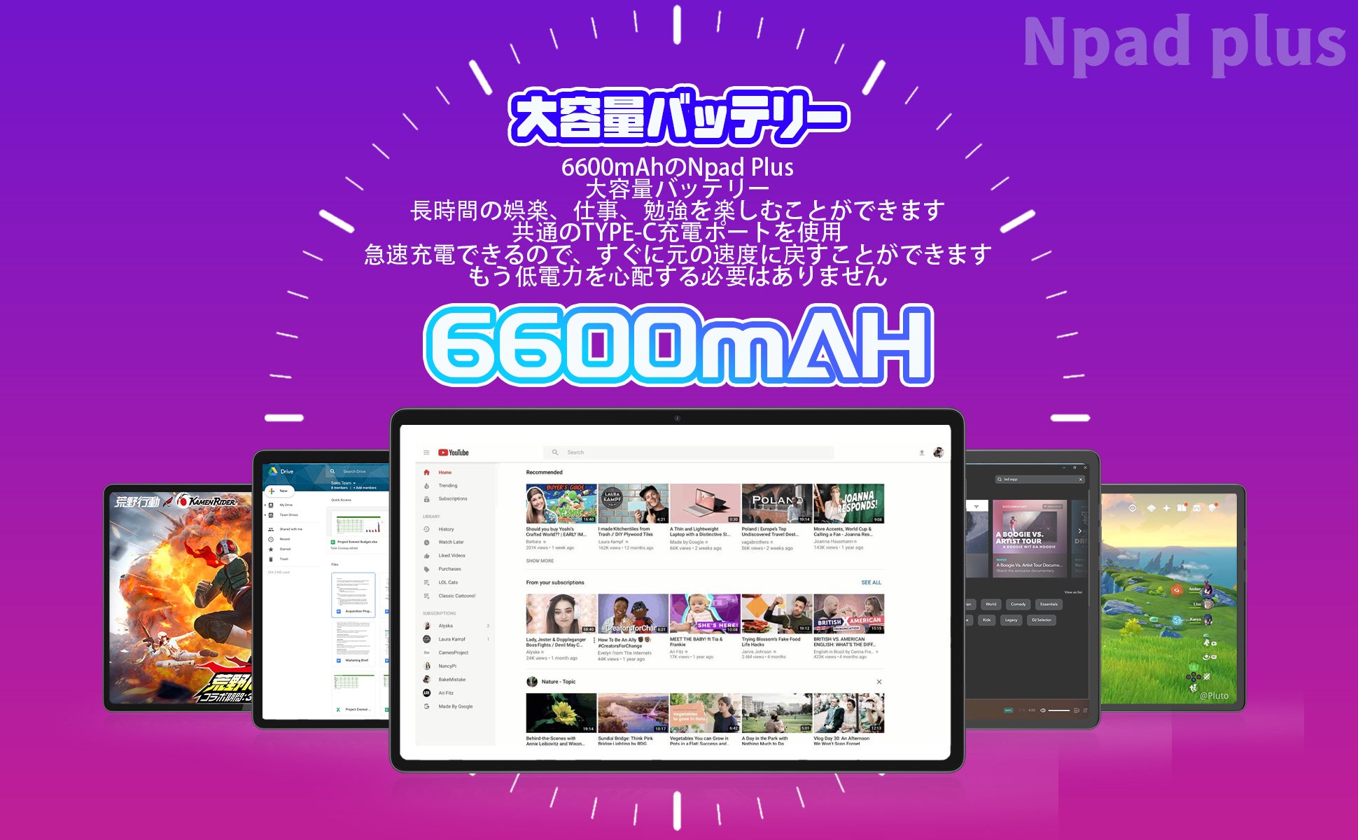 Npad Plus タブレット 10インチ wi-fiモデル は、10.36 インチのディスプレイ画面、2000*1200 2k の高解像度、クリアでピュアな大画面、豊かな色彩と明るさを備えたタブレット コンピューターで、快適な視聴体験を楽しむことができます。すべてのディテールが精巧で人目を引きます。世界のカラフルさを真に復元し、リアルで鮮やかな画像をもたらします。 電子書籍 タブレット 、動画用タブレット 、ゲーム タブレット としても良いチョイスです。android タブレット 内蔵の目の保護モードをオンにすると、長時間使用しても快適に視聴できます 、目が疲れません。 タブレットの内蔵 6600mAh 大容量バッテリーにより、長期間の使用に対応可能。 急速充電が可能な Type-C 充電により、途切れることなく使用でき、勉強、娯楽、仕事の 1 日の時間をサポートします