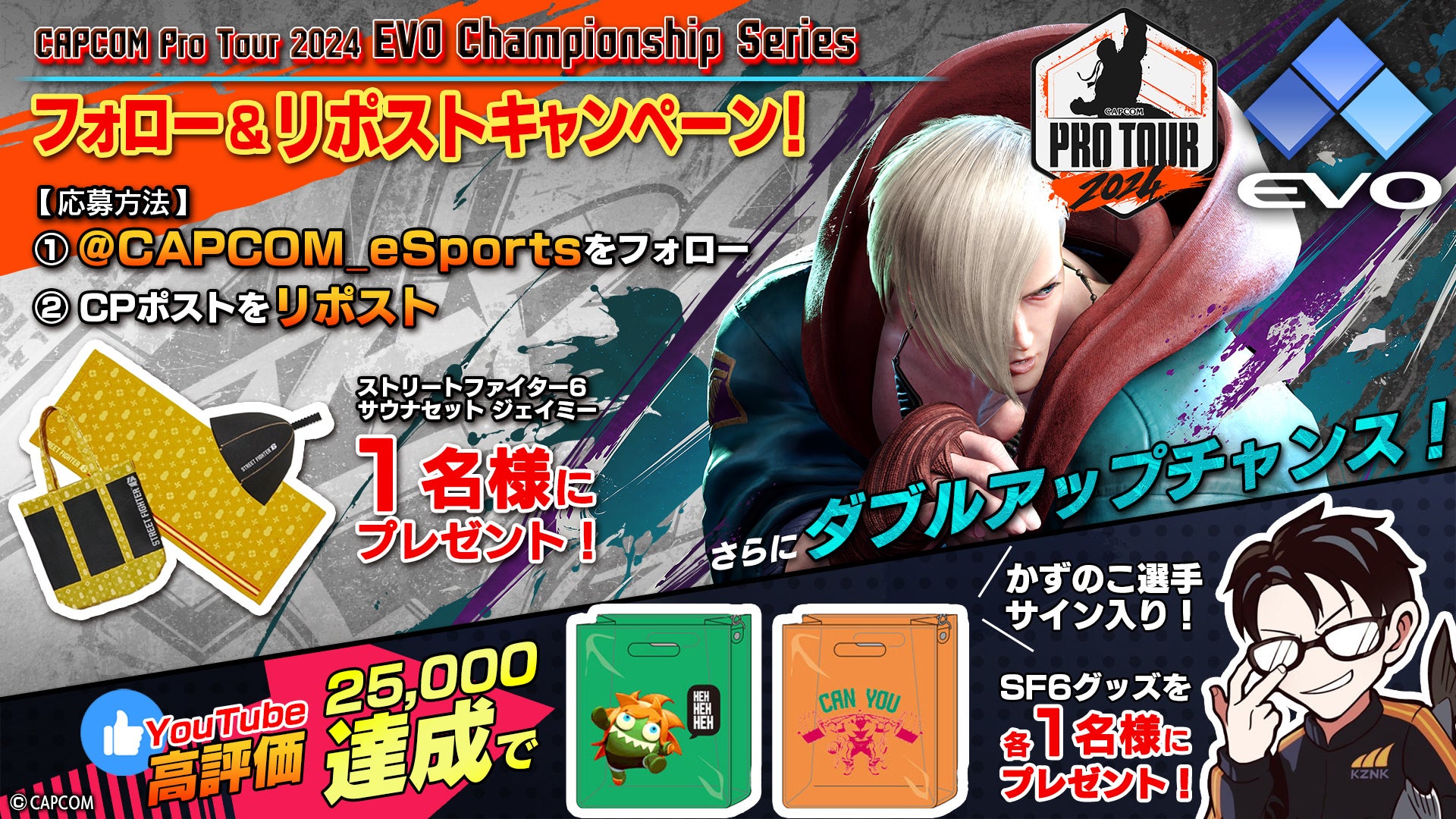 「EVO2024 日本語実況LIVE配信」では、Day1~Day3のYouTube合計高評価数25,000達成で、Day1特別ゲストのかずのこ選手サイン入りの『ストリートファイター6』公式グッズが抽選で3名様に当たるプレゼントキャンペーンも実施中です。