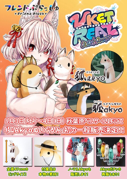 - デオコ® ボディクレンズシート、Vket限定 根羽清ココロちゃんデザインパッケージのデオコ ボディクレンズシート、ココロちゃんとVketちゃんのトレーディングカード、VRChat×Vketオリジナルコラボグッズ、狐Akyoぬいぐるみ、ノーマルAkyoのぬいぐるみ、オリジナルデザインのうちわ、オリジナルペットボトルウォーター、Vket限定ステッカー、浜松市のノベルティグッズ、オリジナルデザインのスマートボール、オリジナル3D アバター“風璃“をモチーフにした限定クリアファイル、サウナ貸し切りチケット、サウナハット、過去のVket Realの公式グッズ