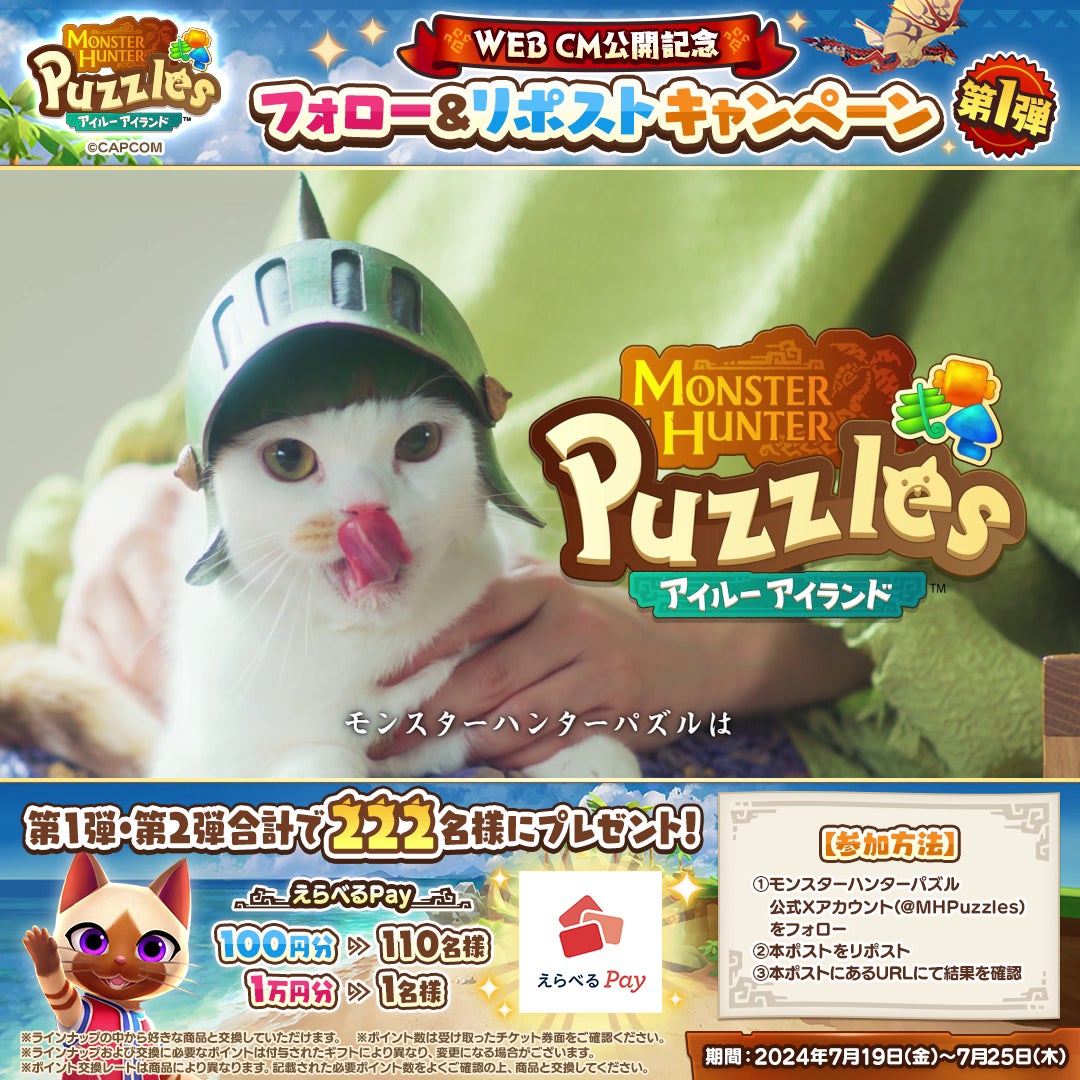 『モンスターハンターパズル アイルーアイランド』公式Xをフォローして、キャンペーン対象ポストをリポストすると、抽選で222名様に「えらべるPay」が当たります。