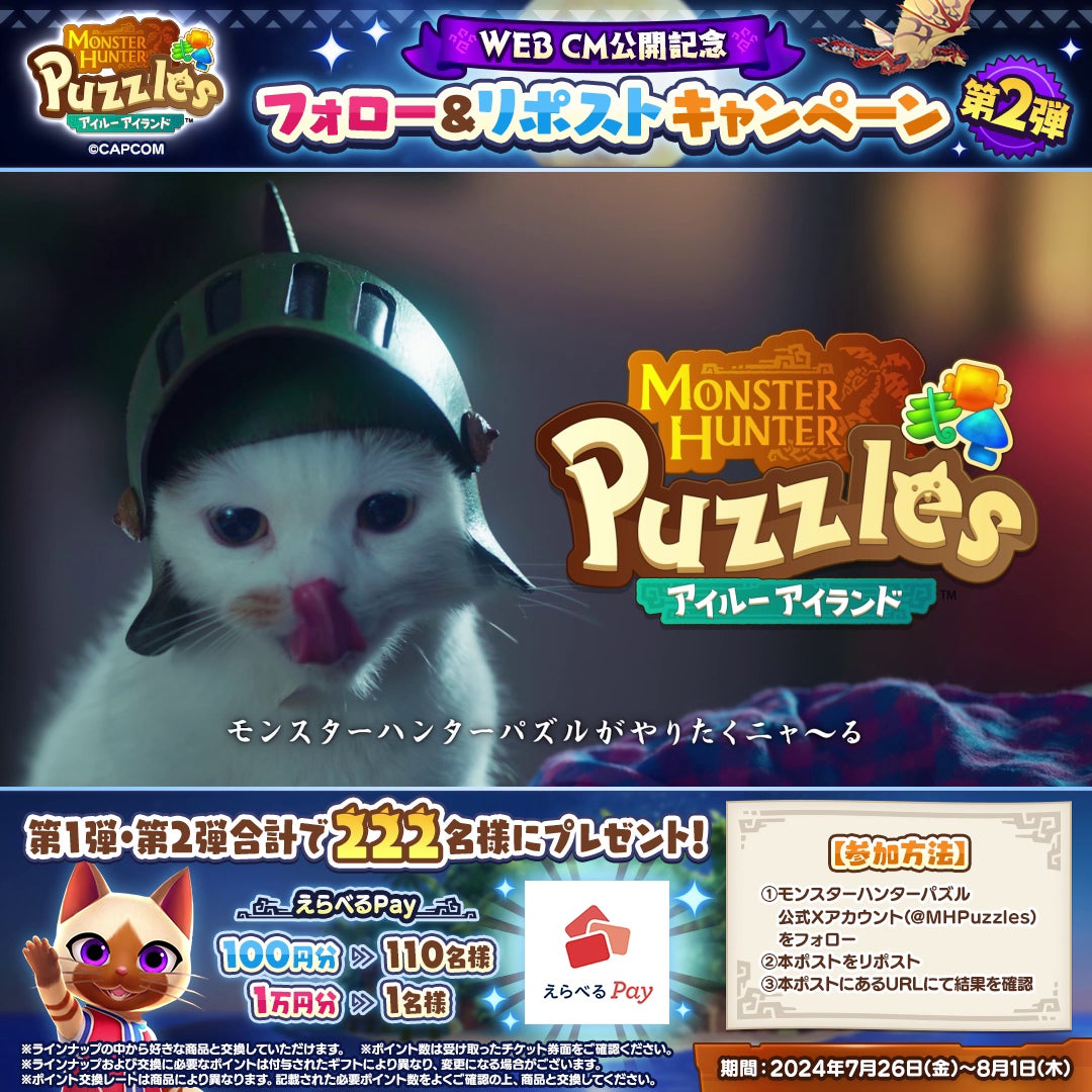 『モンスターハンターパズル アイルーアイランド』は、本日7月19日(金)より、WebCM「アイルーからの告知 <昼間篇> <夜中篇>」を公開しました。