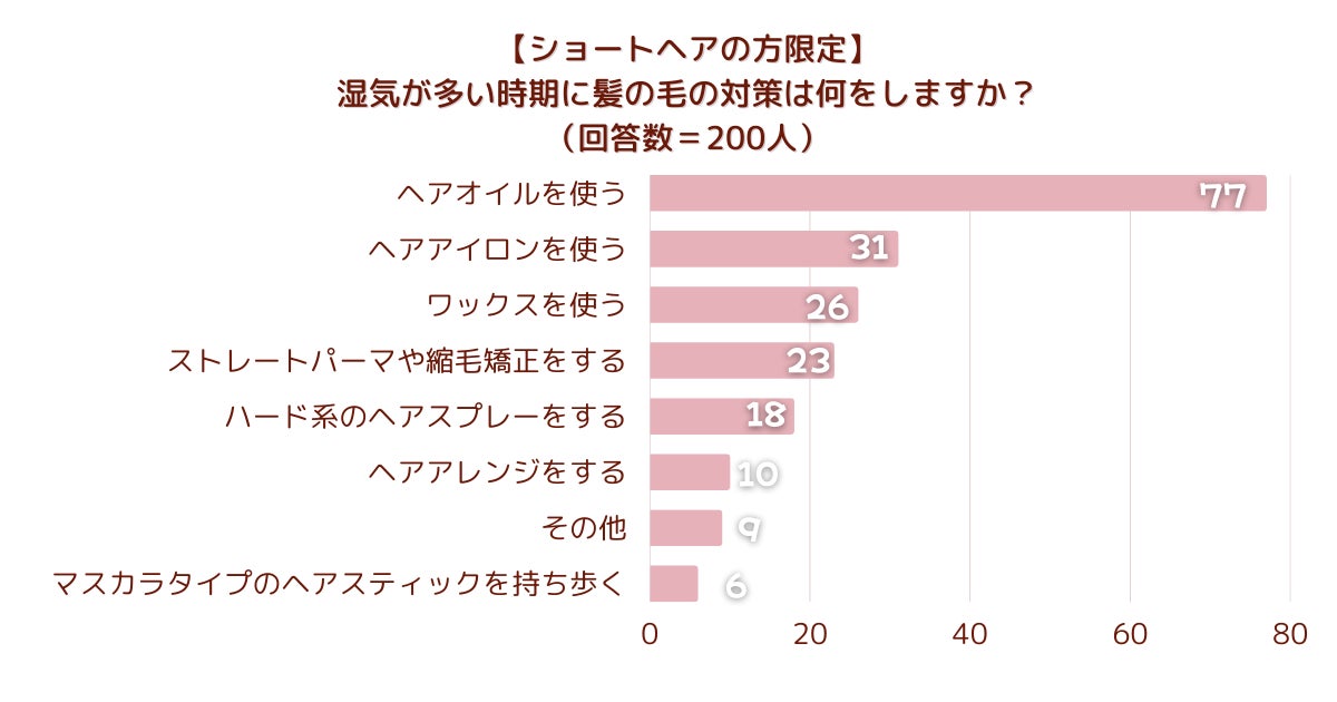 「【ショートヘアの方限定】湿気が多い時期に髪の毛の対策は何をしますか?」とアンケート調査した結果、1位は『ヘアオイルを使う』でした。
