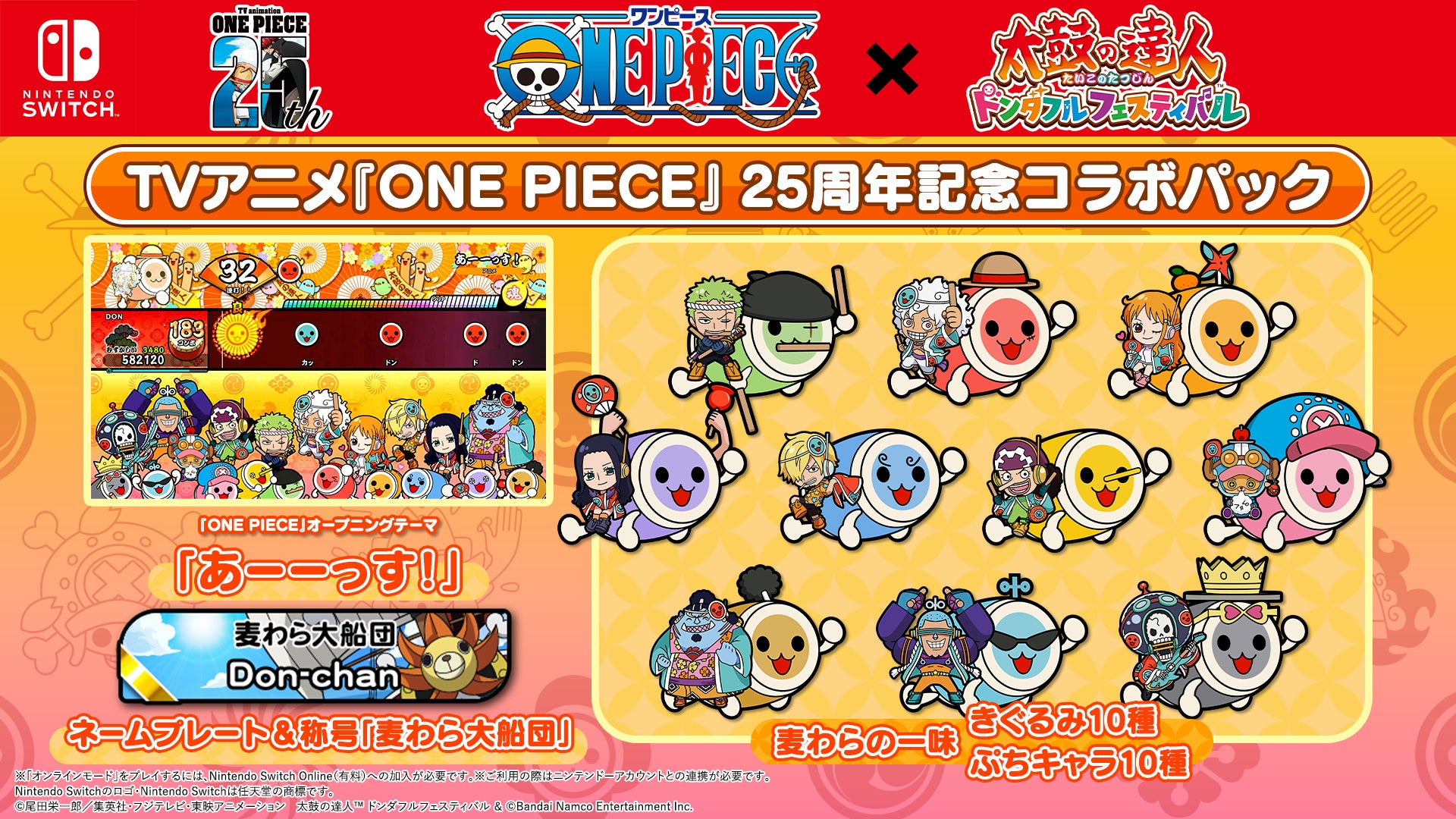 - Nintendo Switch用ソフト『太鼓の達人 ドンダフルフェスティバル』に麦わらの一味のぷちキャラやコラボ衣装が追加。