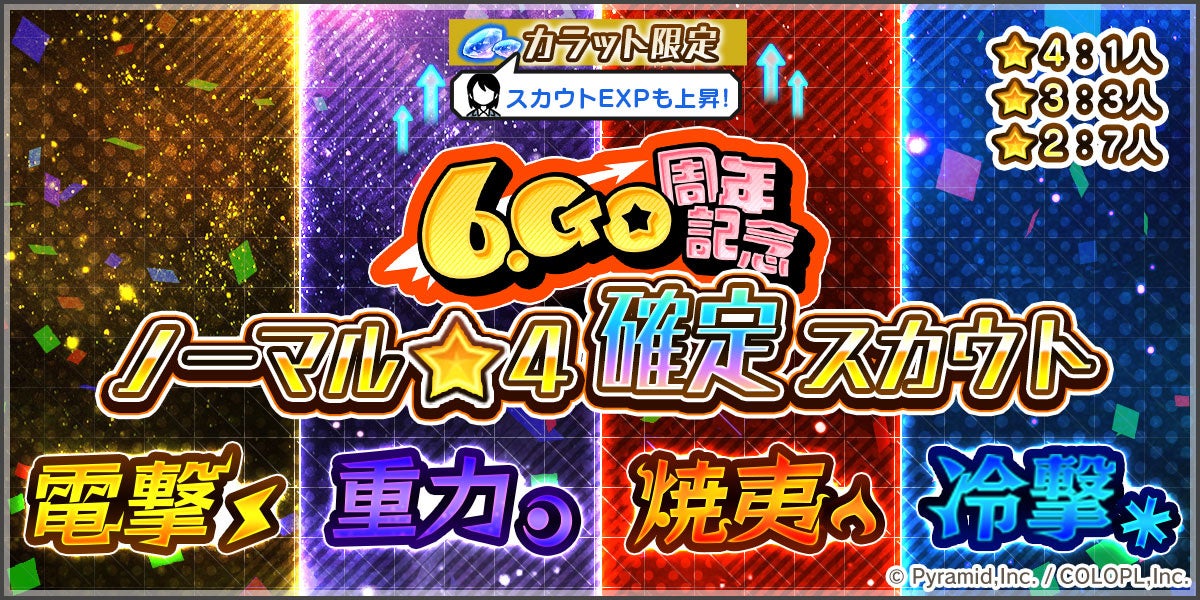 さらに、4種の「ノーマル★4確定スカウト」や「カラット購入キャンペーン」も同時に開催されています。